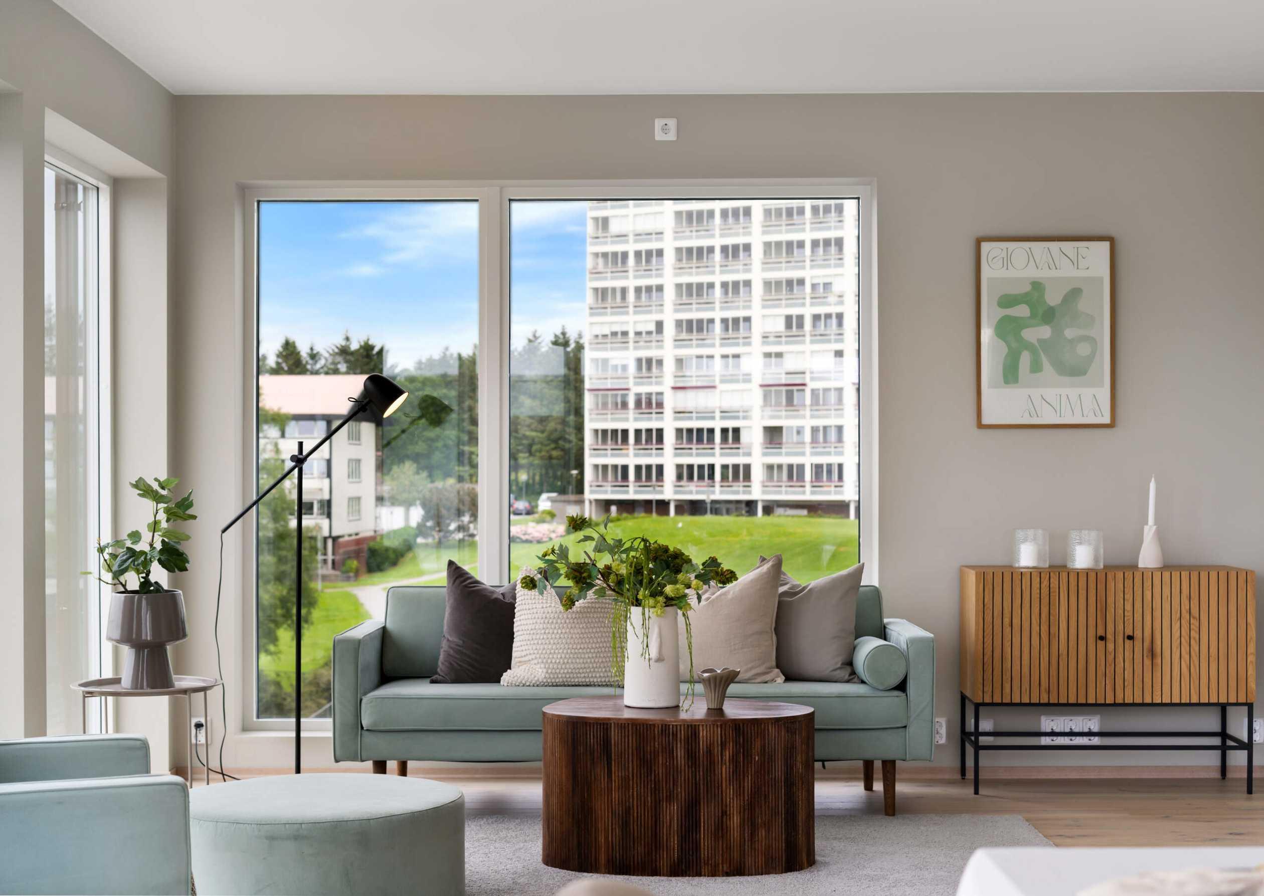 Dette er siste mulighet i Madla Tress - et arkitektonisk flott bygg med kjekke uteområder.