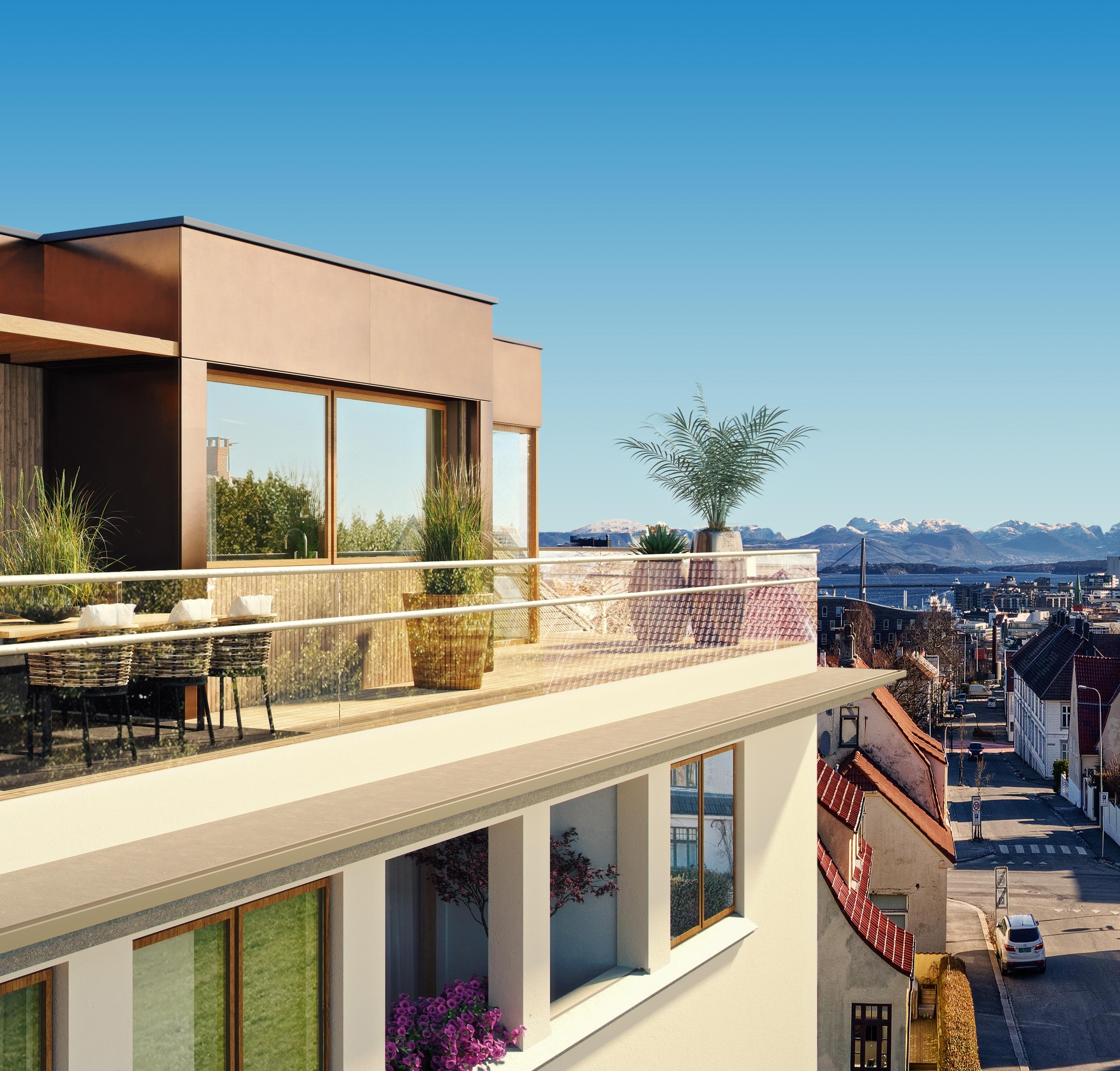 Takterrassen til leilighet NJ-51, Ledaal Park Niels Juel.