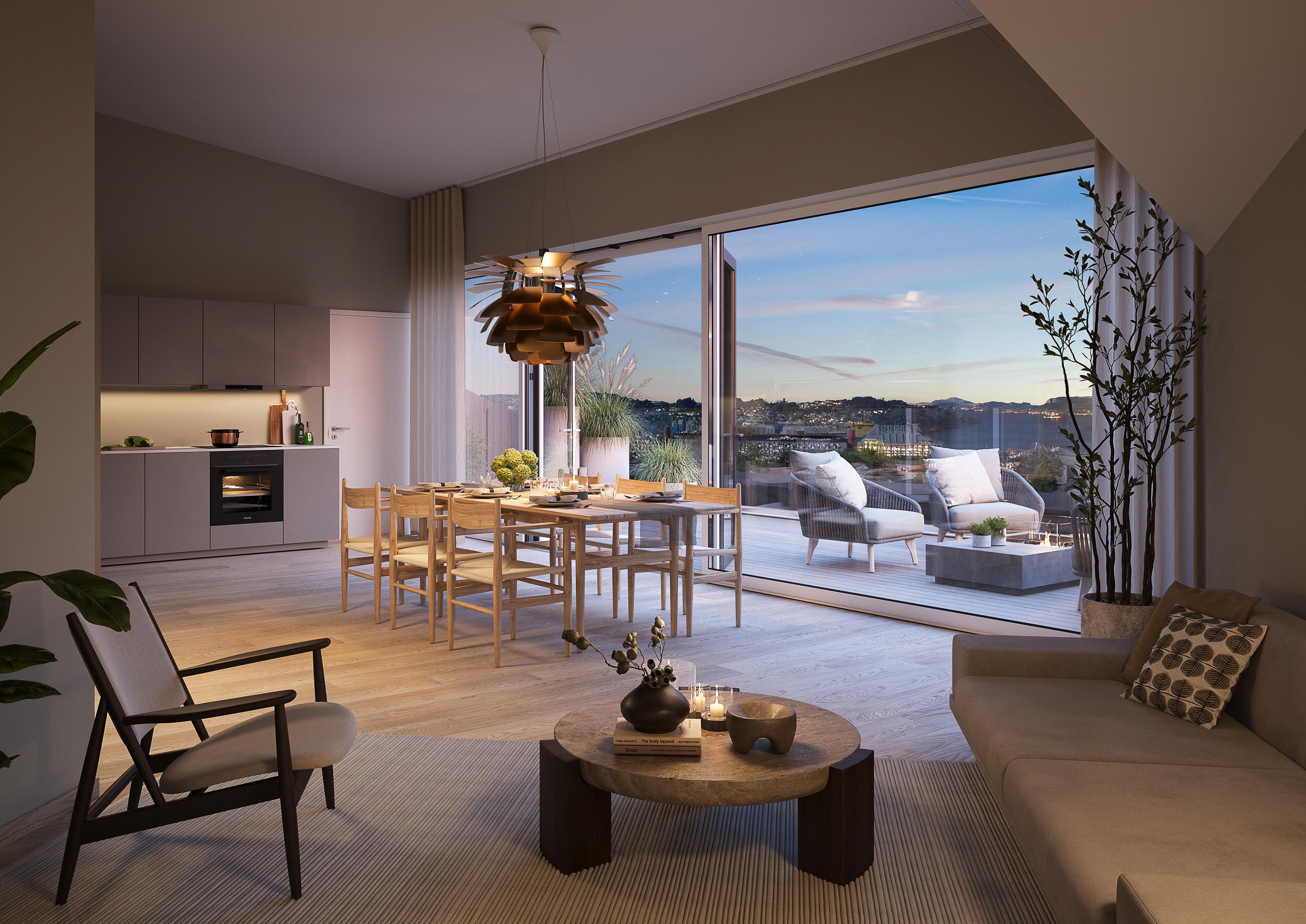 Leil. B-405. Samme planløsning for B-305. Utsikten vil variere ut fra etasje. 3D-illustrasjon. Avvik kan