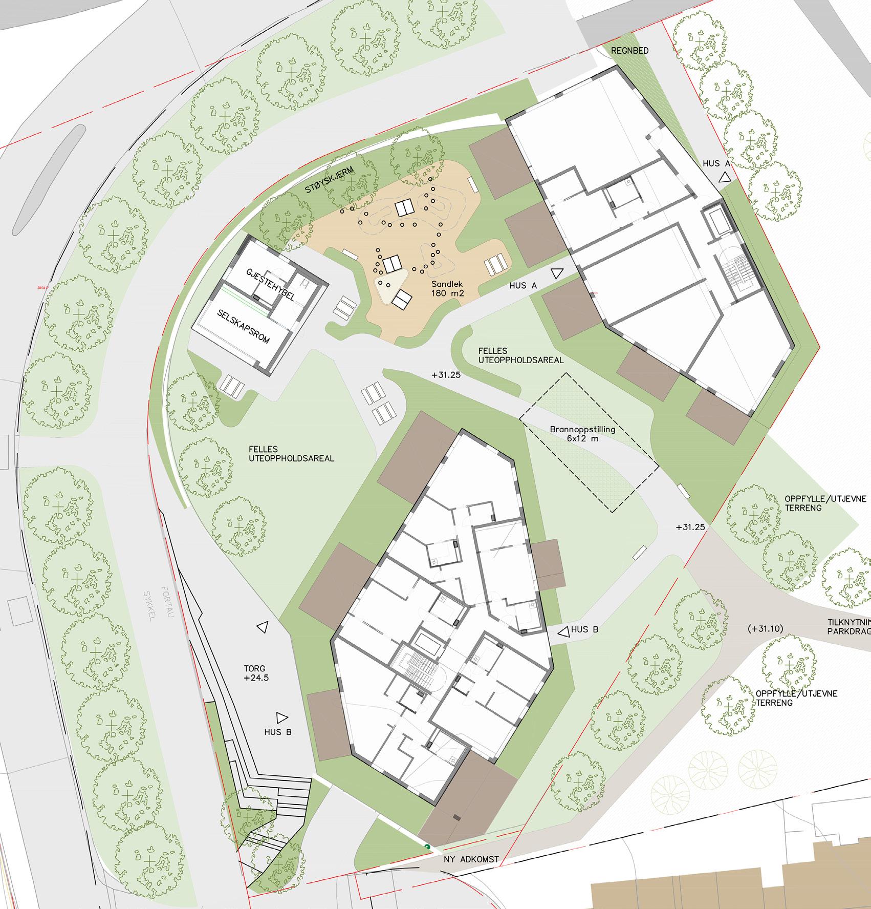 Fellesområdene mellom husene leveres ferdig opparbeidet med beplantning og grønne lunger, samt lekeplasser for de minste barna og hyggelige oppholdssoner der du kan møte nye naboer.