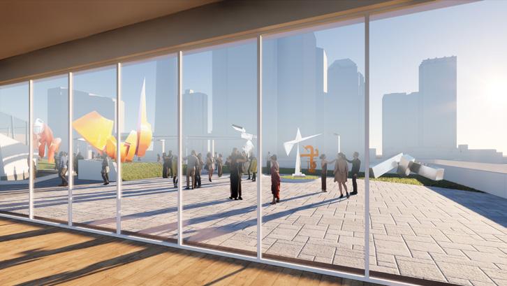At the heart of the lobby is an atrium space that rises 4 floors and emerges on the 5th floor roof terrace. The atrium allows a gentle natural light into the museum spaces and also contains a special gallery space called the Vertical Gallery. This gallery twists as it rises to accentuate the movement of the natural light and to sculpt the space. A small but unique gallery that will be available for artists to engage with special installations. Acoustically controlled from the main lobby and gallery floors the Vertical Gallery will be a place of respite and contemplation in the museum.