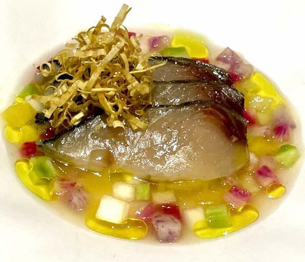 During a recent trip to San Francisco, my husband Steve and I had the privilege of experiencing the Seasonal Tasting Menu paired with wines at Acquerello. The evening was made even more special by the dedicated team at Acquerello. Franco, one of the original Maître ds, Head Sommelier Rafael Santos, and Executive Chef Gresham, all took the time to present and describe each wine and dish, enhancing our culinary journey. The stylish and elegantly decorated restaurant added to the divine culinary experience, making us feel truly appreciated as guests. e nine-course Seasonal Tasting Menu with two additional options was exquisite. We began the dinner with the chef’s surprises for the evening and a glass of Grosjean, Vino Spumante di Qualita Metodo Classico Blanc Noir Extra Brut’ Mas du Jario’ NV. is delicious glass of Brut, made using the traditional champagne method Metedo Classico, was produced near the Alps. e bubbles showcased heavy citrus notes that paired deliciously with the trio of amuse-bouches: Crispy Potato Cannoli lled with a Parmesan mousse with pearls of tru e on top and a sprinkling of gold, warm and savory Financier Cakes stu ed with caramelized onion, and a piece of Comté cheese on the top and then dusted with