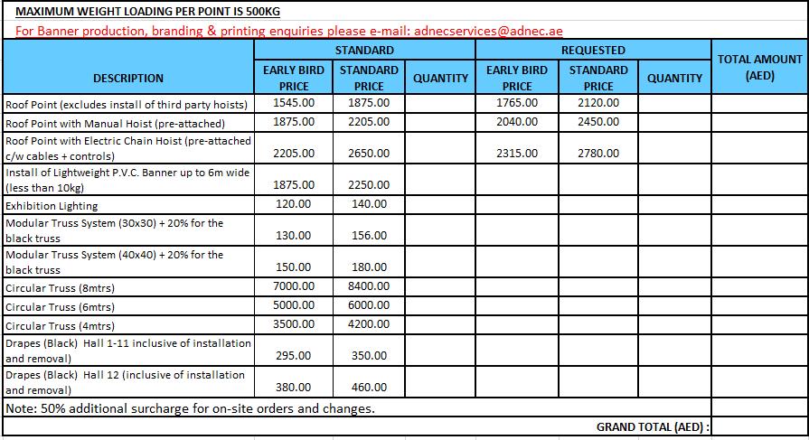 • Successful delivery of your order is dependent on the correct stand number and name of exhibiting company being provided. Please ensure that any changes to the stand number or exhibiting company name are communicated to adnecservices@adnec.ae
