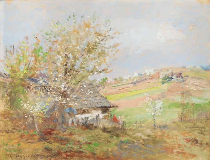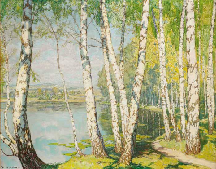 Alois Kalvoda belongs to the sizeable group of Czech painters who studied at the Prague Academy in the landscape school of Julius Marak. In 1900 he travelled to Paris together with the sculptor Josef Maratka, and in the following year visited Munich. Both trips contributed to a major turning point in his artistic output: he abandoned emotive landscape painting for the influences of Art Nouveau Symbolism and Impressionism. Right after his return from Paris, he founded his own painting school, which filled the gap caused by the arbitrary abolition of the Landscape Seminar at the Prague Academy. Kalvoda also lectured on art and wrote reviews of exhibitions. In 1909–1912 he was editor of the artistic journal Dílo [Work]. His typical motifs include farmhouses, meadows lined with trees – especially birches, broad hillsides and rolling hills.