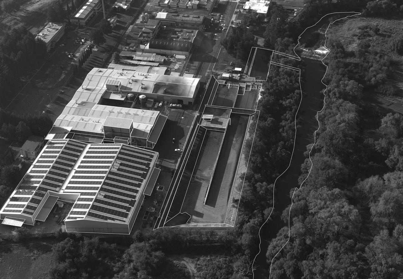 De tal forma, se utilizó un dron para tomar fotos de dichas fábricas y poder tener un análisis más cercano, habiendo tomado las fotos, se trazó con illustrator las fábricas y como estas se relacionaban directamente con el rio.