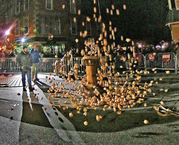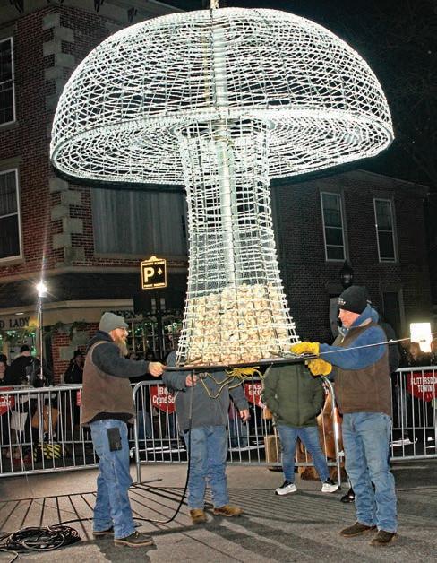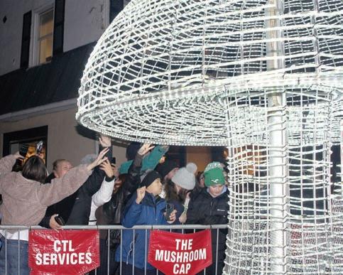 The celebration began on the afternoon of Wednesday, Dec. 31, as the brightly lit mushroom, which had spent the preceding 12 months tucked away in Bob’s Crane headquarters on Birch Street, made its way uptown at 5 p.m., accompanied by a fleet of local firetrucks with their sirens blaring.
