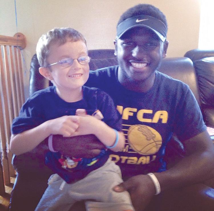young boys his age, he is a huge football fan, and his bedroom is decorated with posters and trinkets honoring his two favorite football teams: the Philadelphia Eagles and the Penn State Nittany Lions. He is often seen around the Schlenner house wearing a Penn State football jersey bearing the number 12, a replica of the uniform once worn by his friend, Chris Godwin. Hayden was diagnosed with cerebral palsy and cerebellar hypoplasia, a condition in which the brain does not develop completely. As a result, his muscle tone is not fully developed, which forces him to get around with the use of a walker. Every year, the top high school football players in Delaware are selected to play in the annual Blue-Gold Game at Delaware Stadium. While the game has come to stand as a showcase of talent, it has also made a substantial altruistic imprint on the state. It benefits the Delaware Foundation for Reaching Citizens, and pairs each player with a child who has a physical or mental disability in the Hand-in-Hand Program.