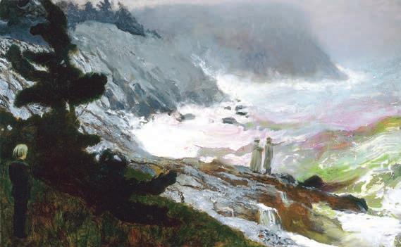 One room is dedicated to thematically similar works done on Monhegan Island, where Wyeth has a home. The arching wing shapes and gaping beaks of the seagulls in his “Seven Deadly Sins” series give enormous energy to the room. There are also several dramatic paintings based on his dreams, in which Wyeth depicts N.C. Wyeth and Andrew Wyeth surveying a stormy sea, as Andy Warhol stands furtively at a distance, watching them.