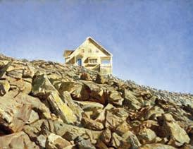 “Ice Floe” and “Berg,” from 2012, are immersive, bone-chilling depictions of ice blocks, blue-black ocean depths, and Wyeth’s home on the shoreline, lit by a sliver of yellow-orange sky.