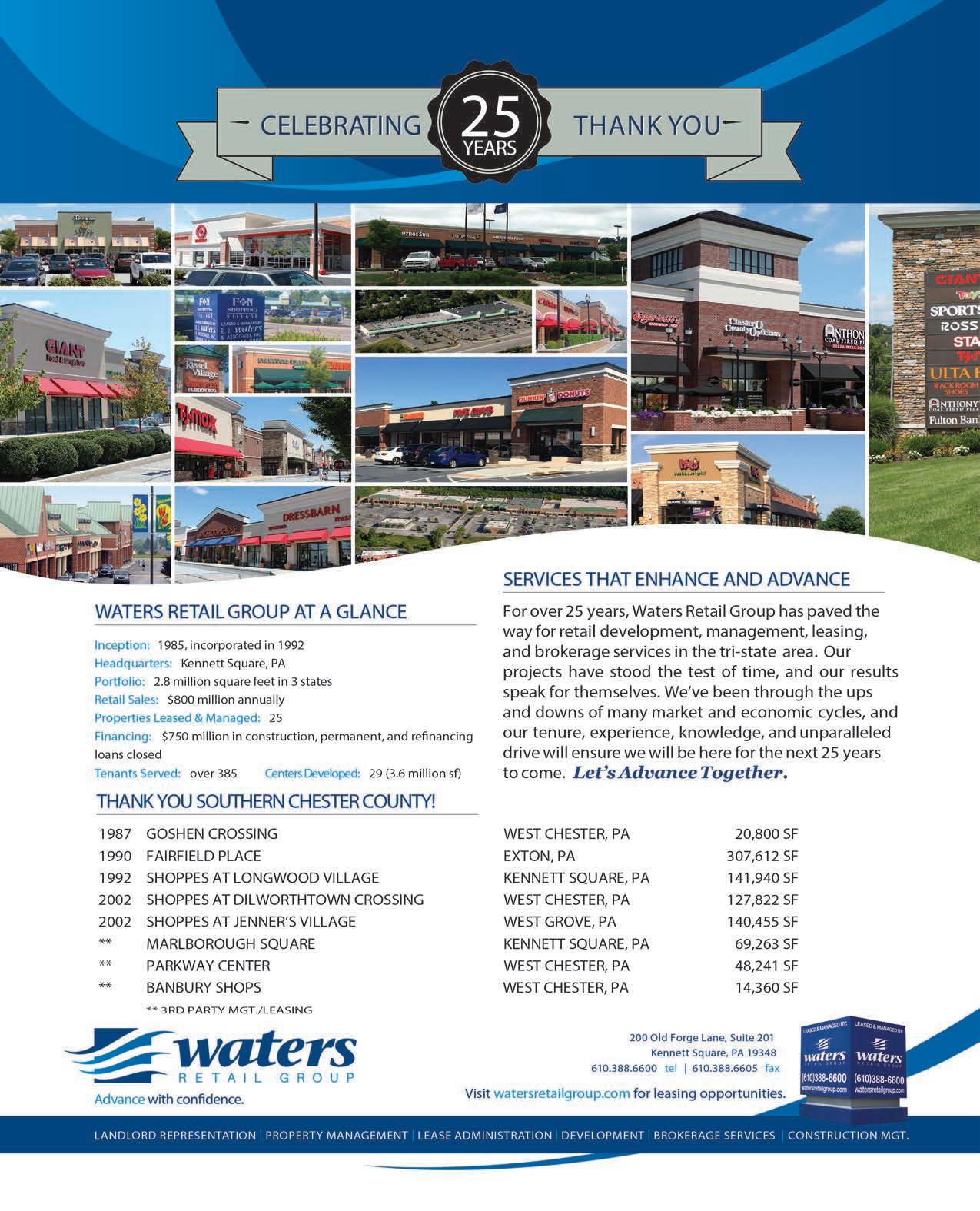 Now in its 25th year, R.J. Waters & Associates, Inc. in Kennett Square is a commercial real estate development, management, leasing and brokerage firm that has to date developed over 3.6 million square feet of retail space. Centers under their care and attention contain over 385 national, regional and local tenants that achieve over $800 million in annual retail sales.