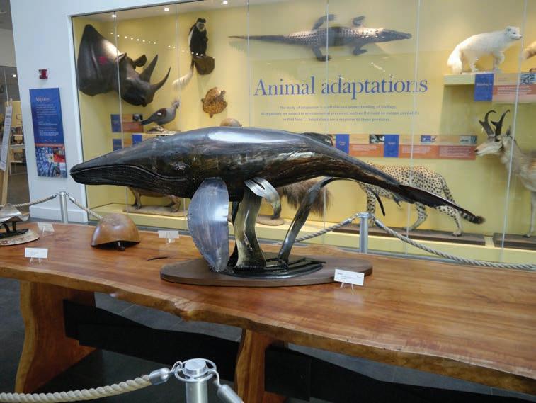 eventually required Bell to cut more than 600 feathers and apply them in layers to give the piece a startlingly realistic appearance. To research his artworks, Bell had access to the taxidermied birds in storage at the museum. “They have 65,000 birds,” Bell said. “They’ve got 135,000 shells. I did a sculpture of a heron. They gave me two drawers of them. I had free rein of the museum. I did a six-foot humpback whale, and then I did an octopus. I really enjoyed doing them.”