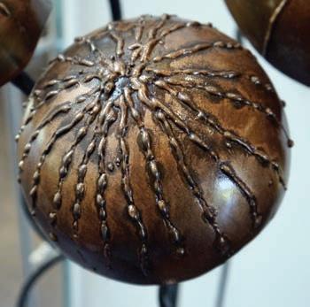 Bell’s freestanding sculptures of jellyrish on long tendrils have become one of his most distinctive pieces. “I like sound an motion,” he said. “I went through a process of probably a year, trying to come up with something that sounded good. Everything failed. Then I found a company that makes these brass hemispheres. The sound was phenomenal. I’ve done a couple of hundred of them since as commissions or donations.”