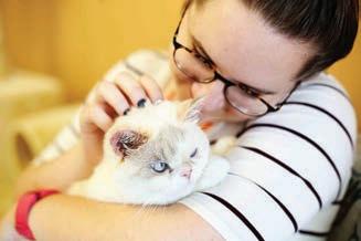 In addition to cuddling and petting the cafe’s primary tenants, guests can browse through a library of books dedicated to cats.