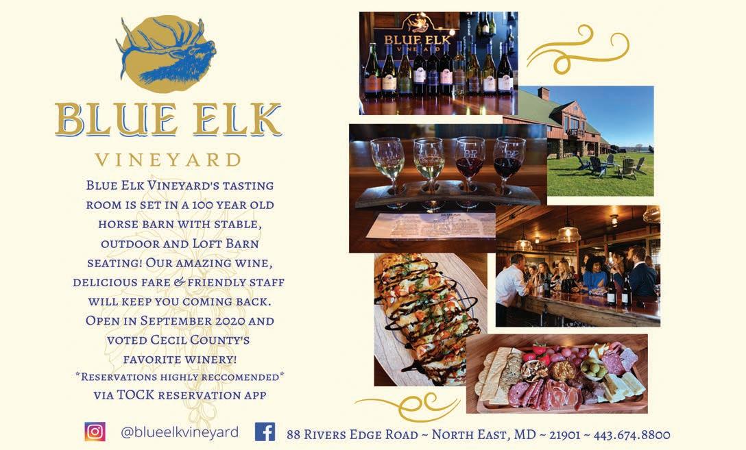 Blue Elk Vineyard is located at88 River’s Edge Road, North East, Md. 21901. To learn more about events and weddings, visit www.blueelk vineyard. com or contact (443) 674-8800. Hours of Operation:Thursday & Friday from 3 p.m. to 8 p.m., and Saturday & Sunday from 12 p.m. to 7 p.m.