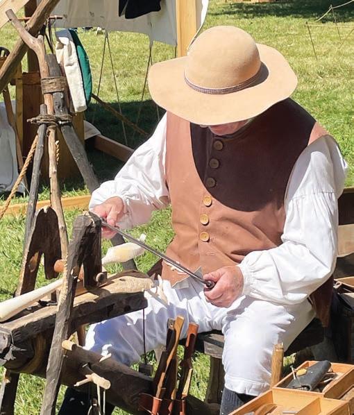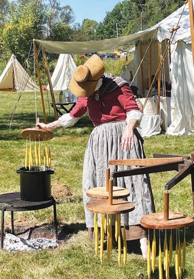 Historic Chadds Ford Days also introduced visitors to “living history,” such as the candle-making by volunteer Katelyn Johnson. Dressed in period garb, she demonstrated to the crowds how candles were made by carefully dipping a wooden paddle containing a set of wax-coated wicks in the heated wax and hanging it back on the circular wooden drying rack. She reached for another paddle with wicks and wax that were already drying and repeated the process.