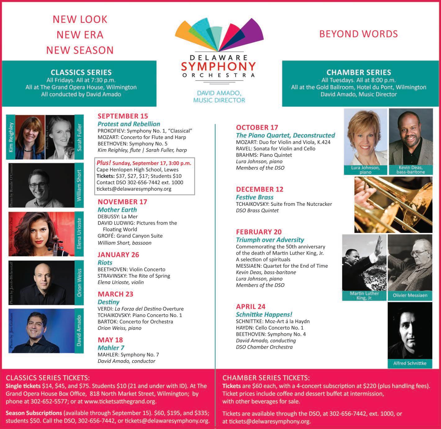 Classics Series subscriptions are available until Sept. 15, 2017, for $60, $195, and $335; student subscriptions are $50. To order subscriptions, or for group rate information contact the Delaware Symphony Orchestra at 302-656-7442, ext 1000, or visit the website at delawaresymphony.org.