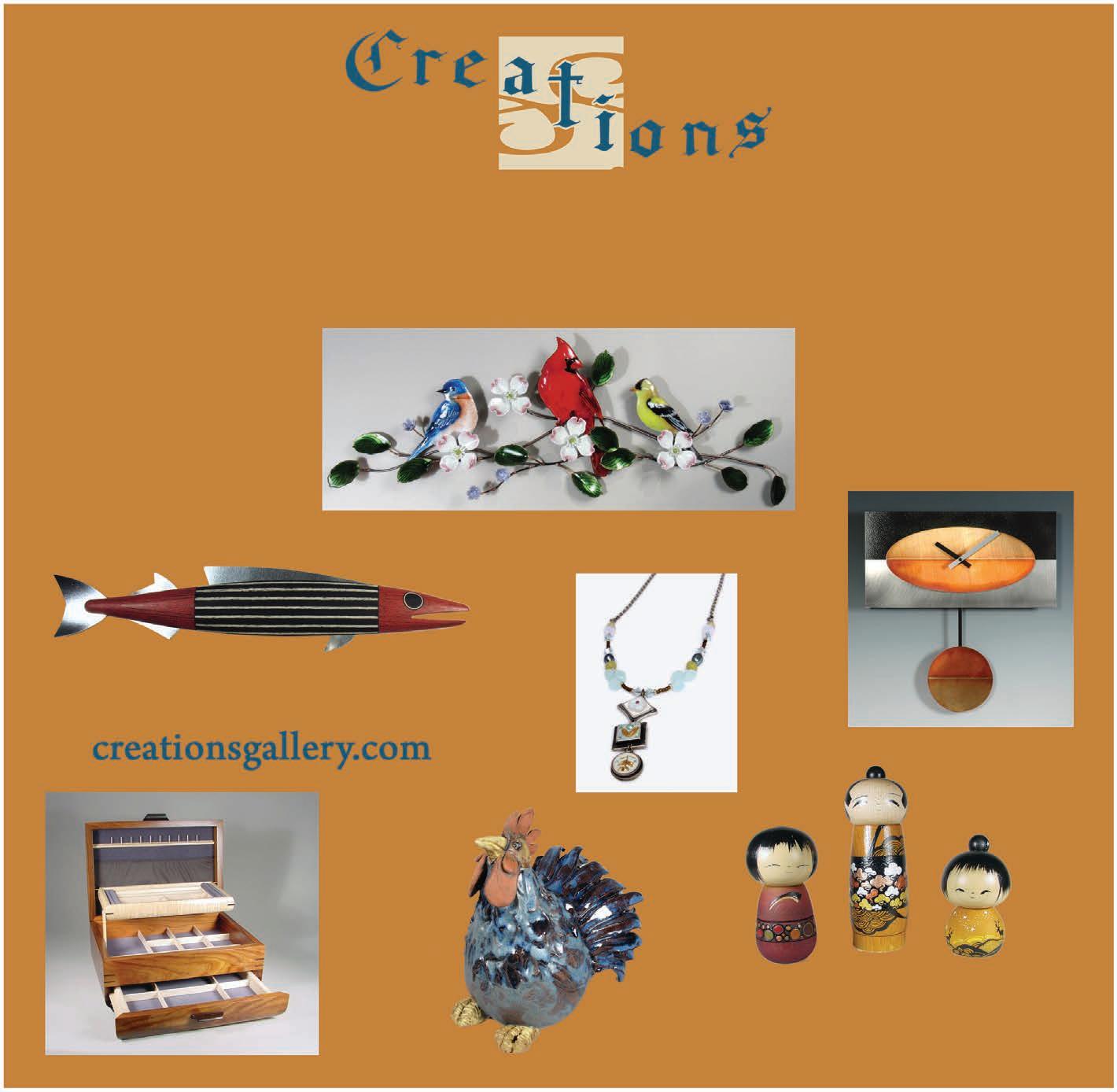 For twenty five years, Creations Gallery has represented fine craft artisans from across the United States and Canada. Opening as Creations Fine Woodworking Gallery in 1992 at the historic Garrett Snuff Mills in Yorklyn, Creations initially featured the work of over fifty regional woodworkers. Over the following years, the gallery relocated to Greenville and ultimately to Hockessin. Through the years, the three-dimensional media focus expanded to include jewelry, ceramics, metal and glass representing a wide selection of hand-crafted gifts, furnishings and accessories for home and office.