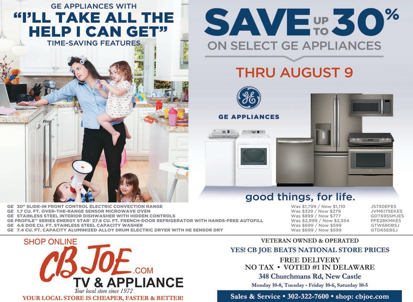 home appliances, televisions, and repair service. Every day, CB Joe sale prices are compared to match or beat all the big box stores and even Amazon prices. The computer software helps us to easily get you the best price. Shoppers can search the website CBJOE.COM to compare and order online or call Jim, Joe, Hugh, or Jason. Free delivery is available, with no sales tax. Over 1,000 models are available on the CB Joe website and almost all of that is available in one day.
