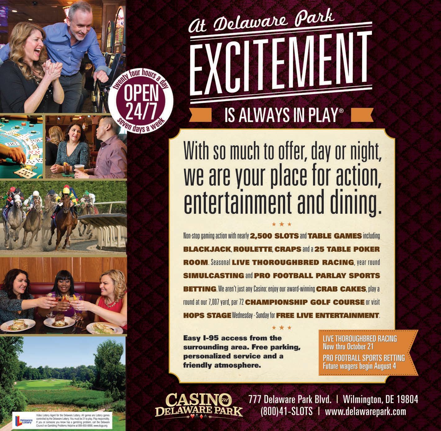 Delaware Park is Always in Play just minutes away from Chester County. This multi-level, non-smoking entertainment and gaming facility offers something for everyone 24/7: 2,500 slot machines, an array of live table games, cash and tournament poker rooms, Keno, free Wednesday-Sunday evening live entertainment at HOPS stage and many dining options. The adjoining Clubhouse offers additional dining choices, seasonal pro football parlay sports betting, year-round simulcasting and live Thoroughbred horse racing. Please check www.delawarepark.com for the 2015 racing schedule and current promotions/specials.