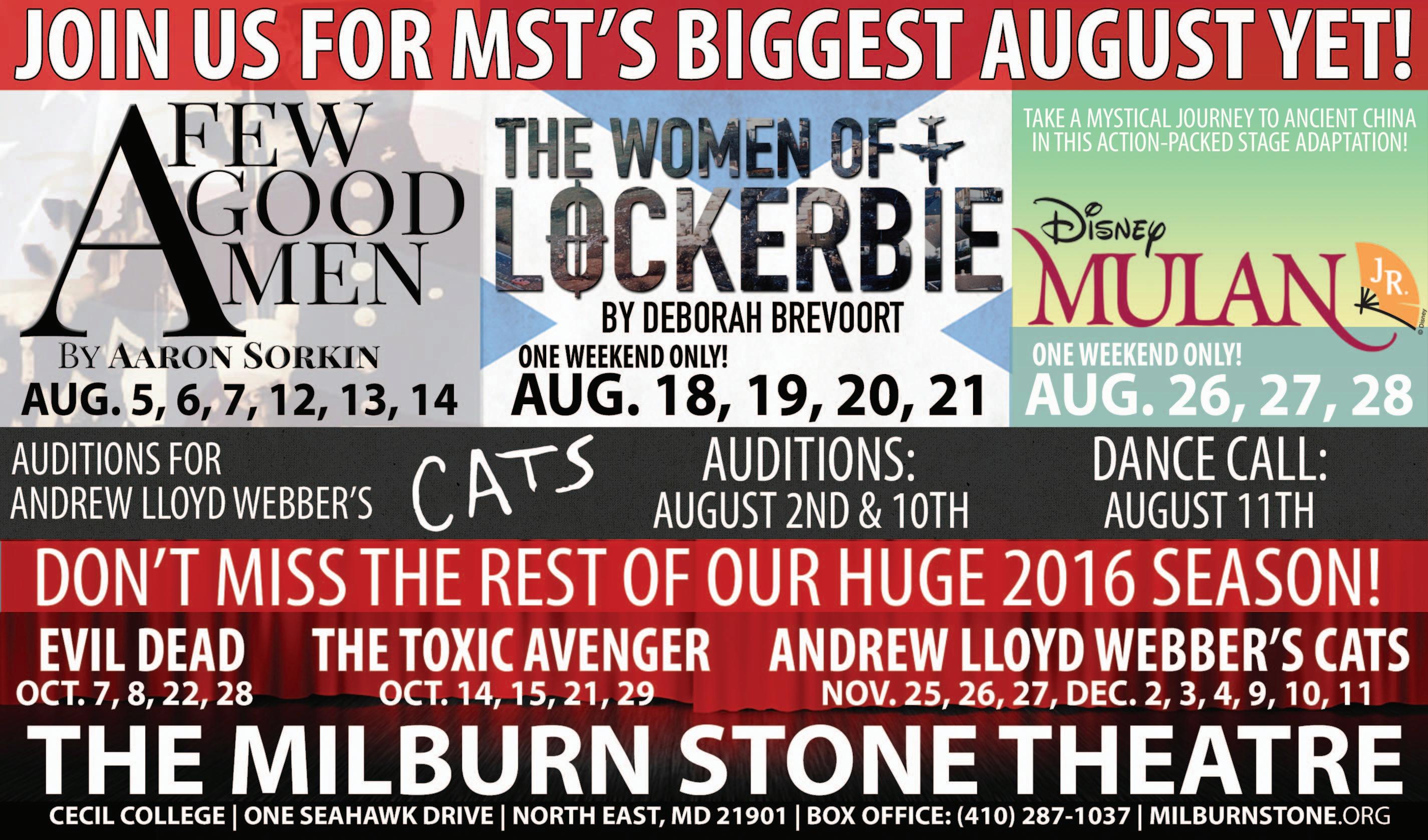 The Milburn Stone Theatre at Cecil College is heating things up this summer with three big productions taking over the entire month of August. First up, an iconic production of the modern classic, “A Few Good Men” by Aaron Sorkin (“The Social Network,” “The West Wing,” and “The Newsroom.”) Known around the world for the popular 1992 movie adaption and its legendary catchphrase, “A Few Good Men” is sure to elicit cheers and leave audiences wanting more in this taut and provocative courtroom thriller.
