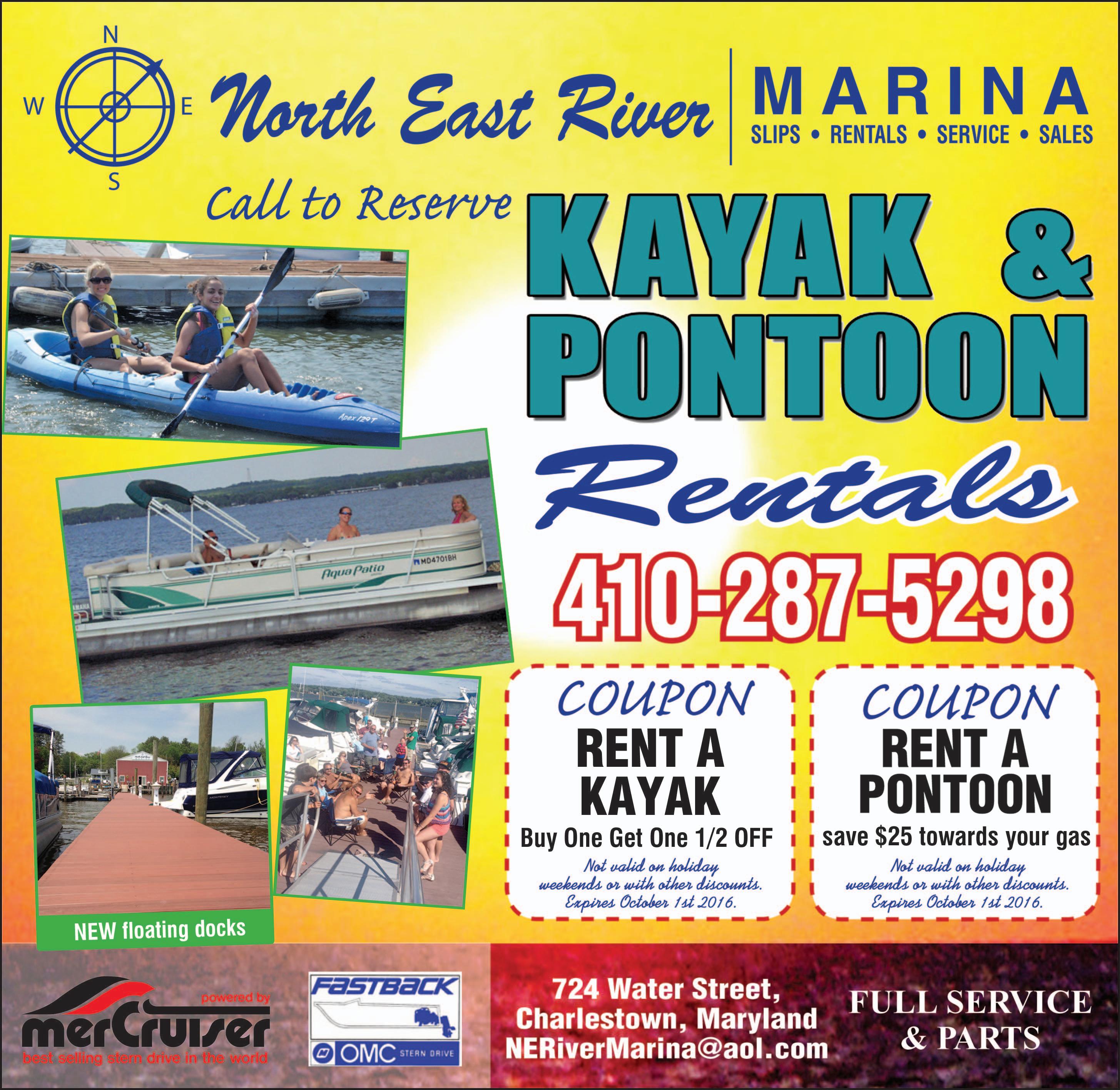North East River Marina is located where Caroline Street meets Water Street, walking distance to local entertainment in the beautiful, historic town of Charlestown, MD. Charlestown’s playground and four sandy beaches are less than a mile away. As the only marina to provide rental motor boats, on the Upper Chesapeake Bay, North East River Marina has a variety of sizes of Pontoon boats and Kayak boats available by the hour, day or week.