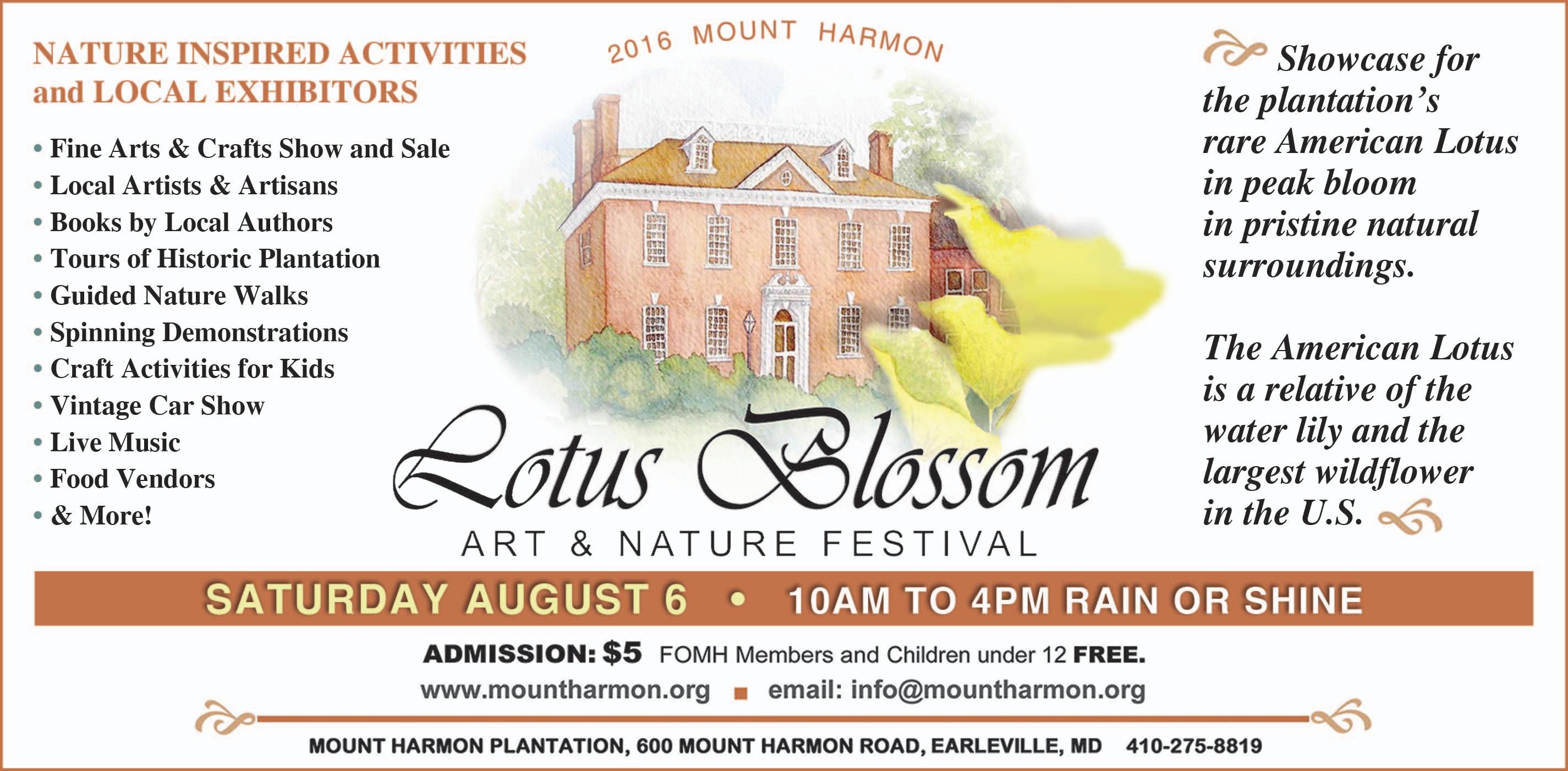 Visitors will delight in seeing the rare American Lotus in full bloom, enjoy local artists, artisans, fine arts & crafts sale, authors and naturalists, nature and craft activities for kids, nature and garden walks, a classic car show, live music, food and beverage vendors, Manor House Tours, and much more. Contact info@ mountharmon.org for full list of exhibitors and activities. Advance tickets are $5, and can also be purchased upon entry. Children under 12 can enter for free. For information, call 410-275-8819 or e-mail info@mountharmon.org.