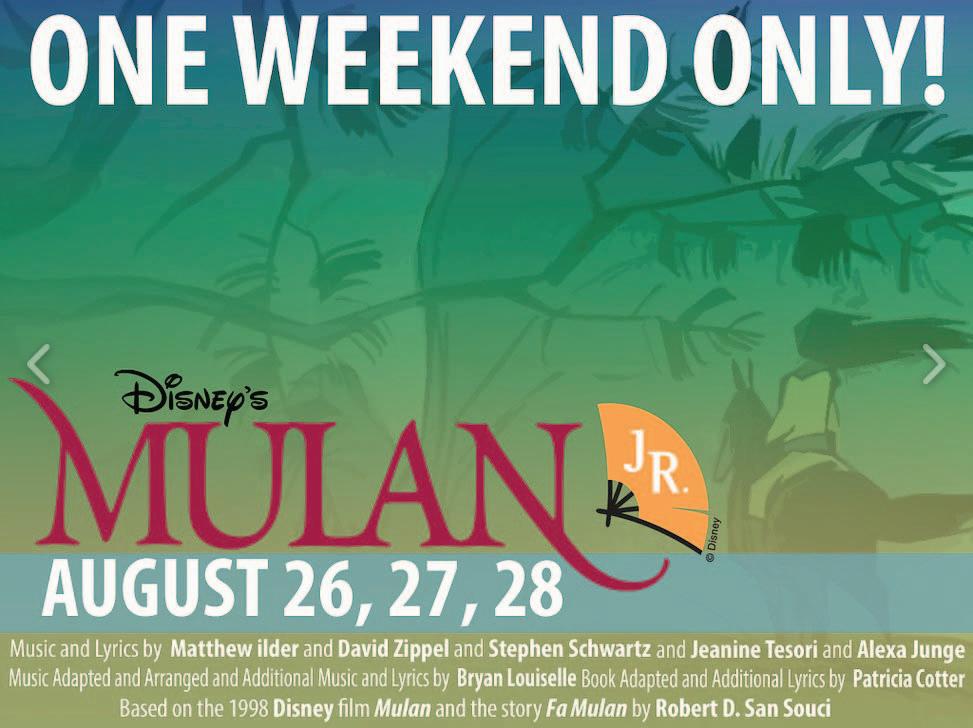 The third production is suitable for the entire family—“Disney’s Mulan Jr.” Based on Disney’s Oscar-nominated film, “Disney’s Mulan Jr. is a heartwarming celebration of culture, honor and the fighting spirit. With hit songs and a story packed with action, humor and heart, this show brings ancient China to life with a modern sensibility all performed by a cast of children and young adults eighteen years and younger.