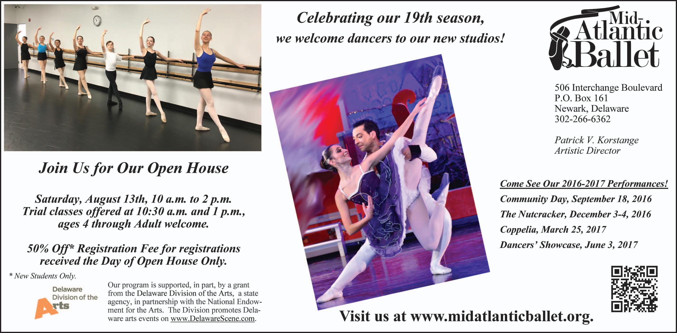 Mid-Atlantic Ballet (MAB) has a 19-year tradition of classical ballet instruction that focuses on ballet as the foundation for all styles of dance. Artistic director Patrick Korstange and his staff are all highly trained and active dancers in the community. The instructors promote dancers upon their demonstrated ability and maturity level. Instead of recitals, we give our dancers the opportunity of performing in full-length ballets. We perform two full-length ballet performances at Mitchell Hall on the University of Delaware campus during the year. Our ballets feature original choreography by our Artistic Director and his staff. Once dancers are promoted to the trainee program, they are eligible for all MAB performances. All levels of the ballet are able to participate in our end of year Dancers’ Showcase in June. A key advantage of MAB for our parents is the low cost of supplying their child with the basics needed for dance class. Parents only need to buy tights, leotard and ballet shoes for their children. We offer these items for sale new or gently used in our studio. MAB provides, with the help of our talented wardrobe department, the costuming required for performances.