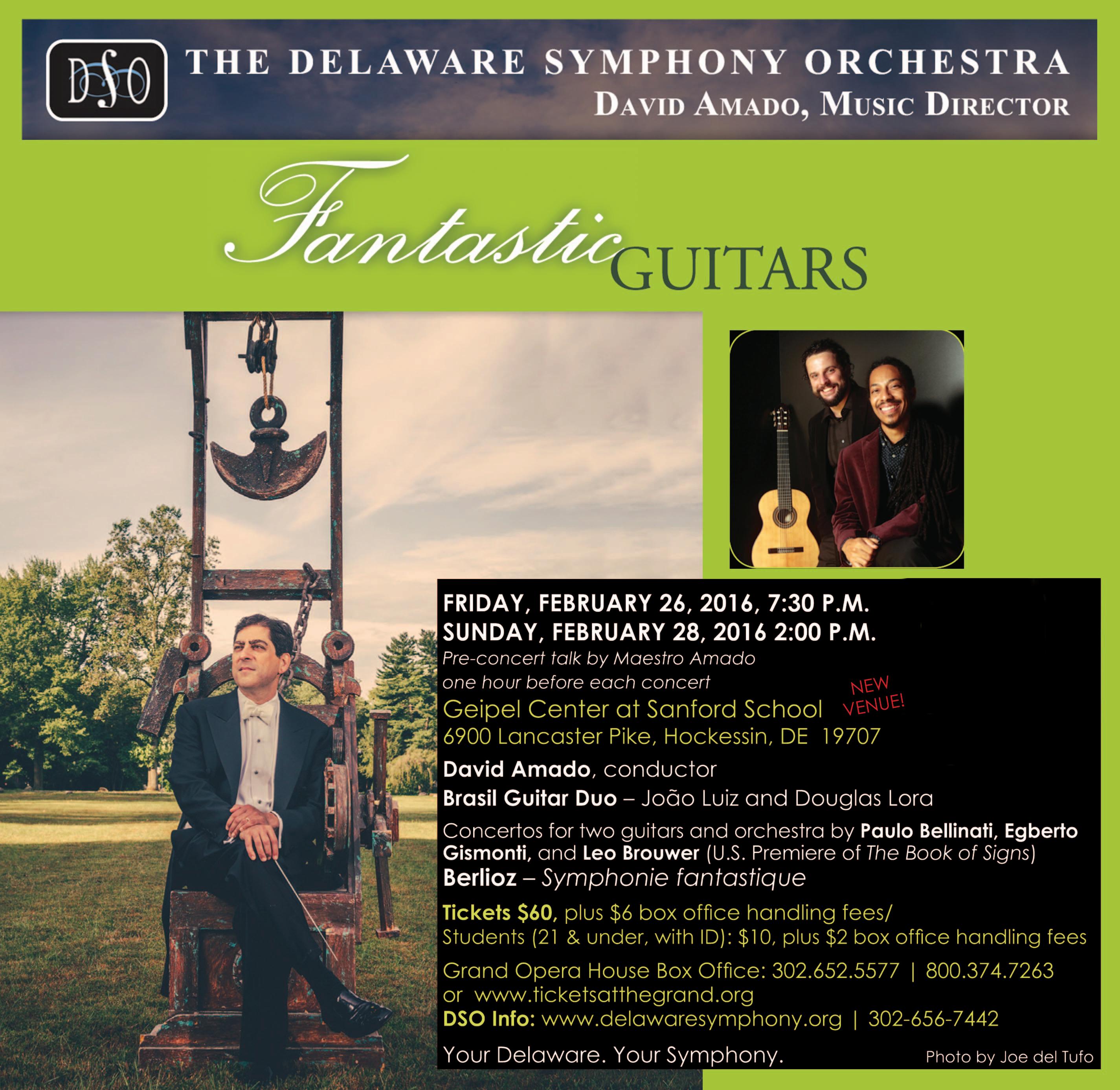 Music Director David Amado will conduct the DSO and Brasil Guitar Duo in the concerts, titled “Fantastic Guitars” on Friday, Feb. 26, at 7:30 p.m., and Sunday, Feb. 28, at 2:00 p.m., at the Geipel Center at Sanford School in Hockessin, Del. Following the guitar concerti, the second half of the concert will be devoted to the monumental Symphonie fantastique of Hector Berlioz.