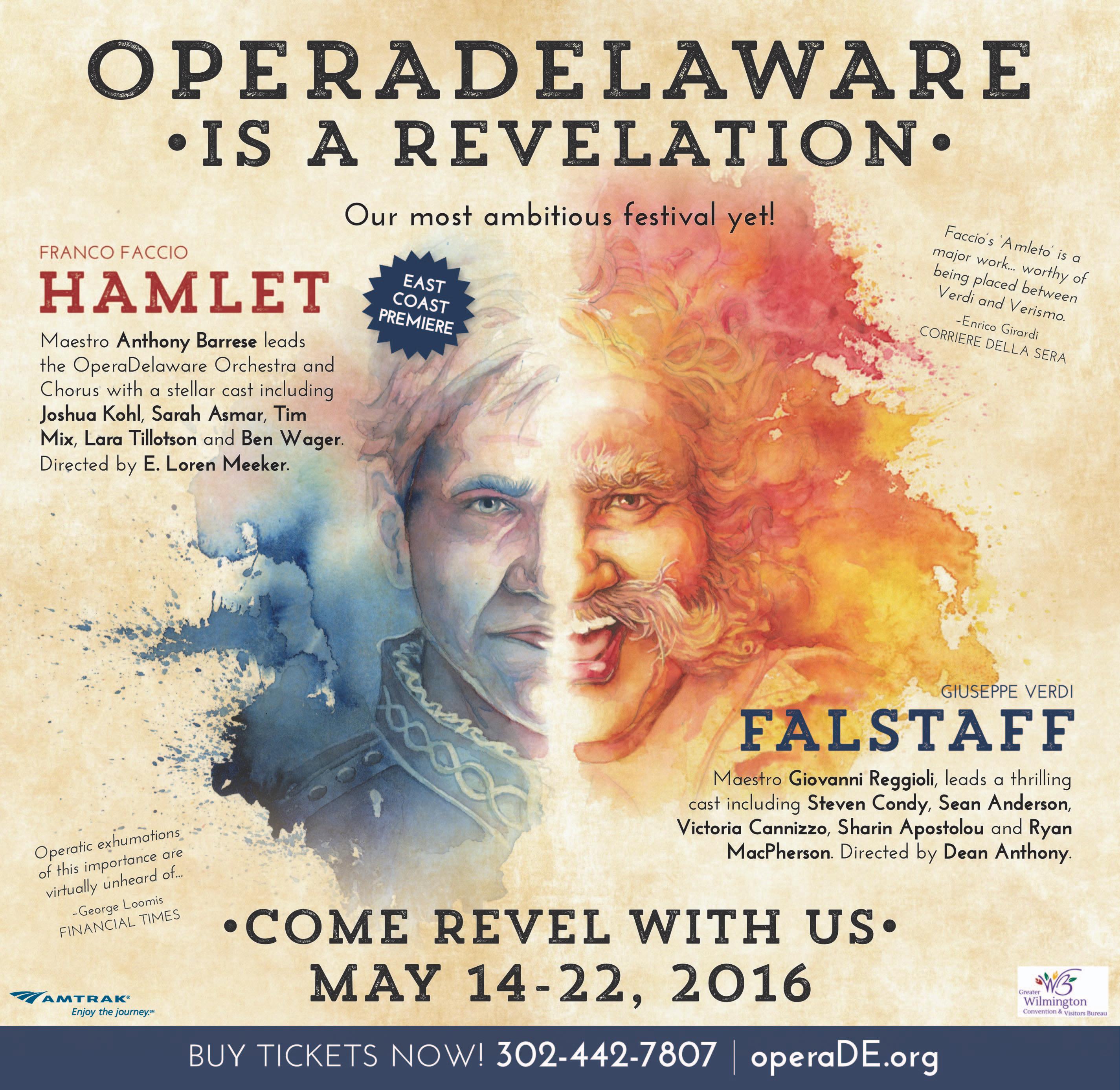 Amleto will be staged by OperaDelaware, starring Joshua Kohl as Amleto, Sarah Asmar as Ofelia, Tim Mix as Claudius, and Lara Tillotson as Geltrude. Maestro Anthony Barrese conducts and E. Loren Meeker directs. For tickets, visit www.operade.org or call 302-442-7807. Performance dates at the Grand are: