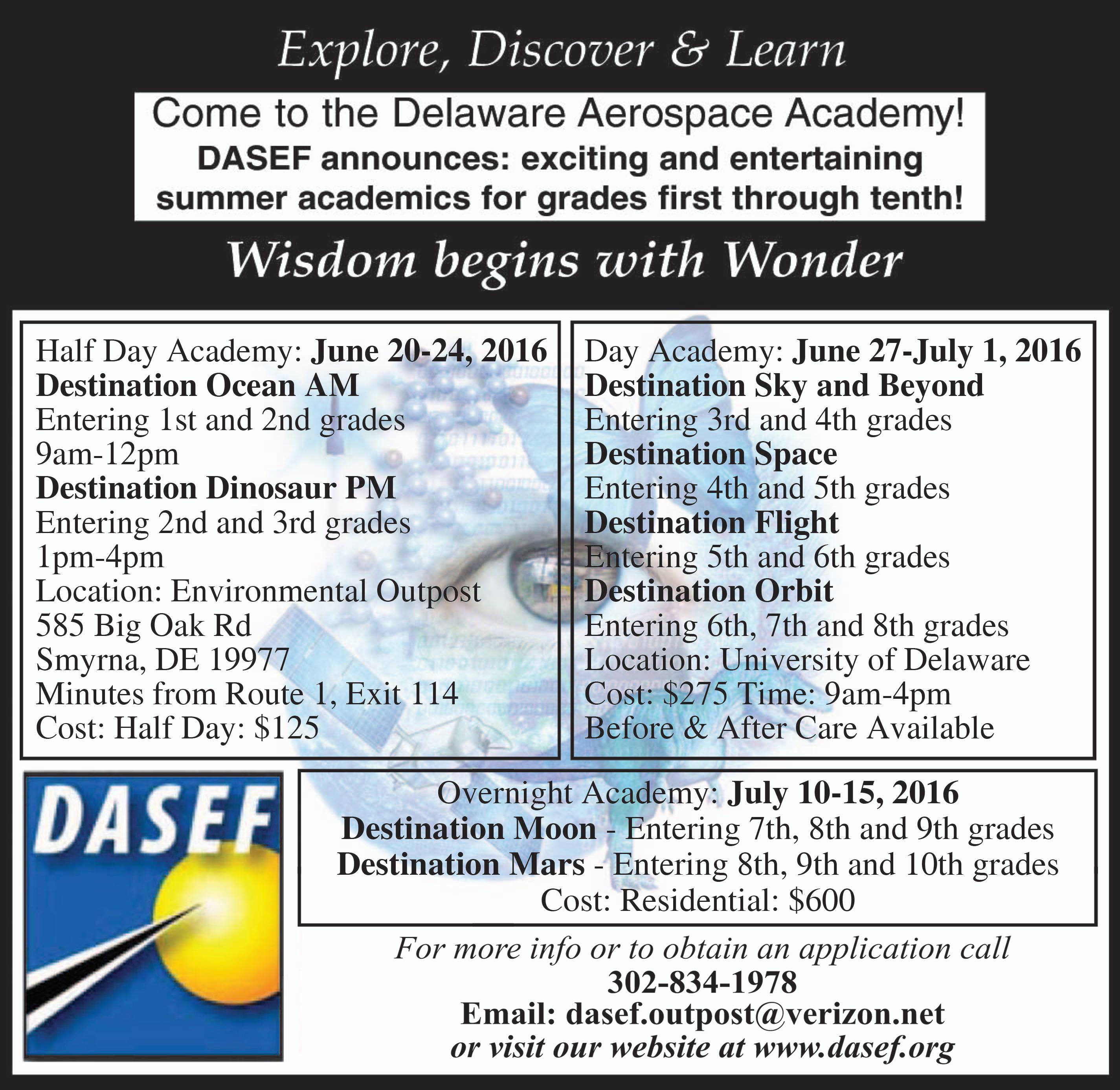 In operation since 1990, the objective of the Delaware Aerospace Academy is to provide hands-on training and experiences through our Destination academies in related activities and fields. Throughout the week, girls and boys in grades 1 - 10 are continually challenged to think, create, solve, build, and work cooperatively. All academies are designed to integrate the study of science, technology, engineering, and mathematics using Earth and Space Education as the unifying framework.