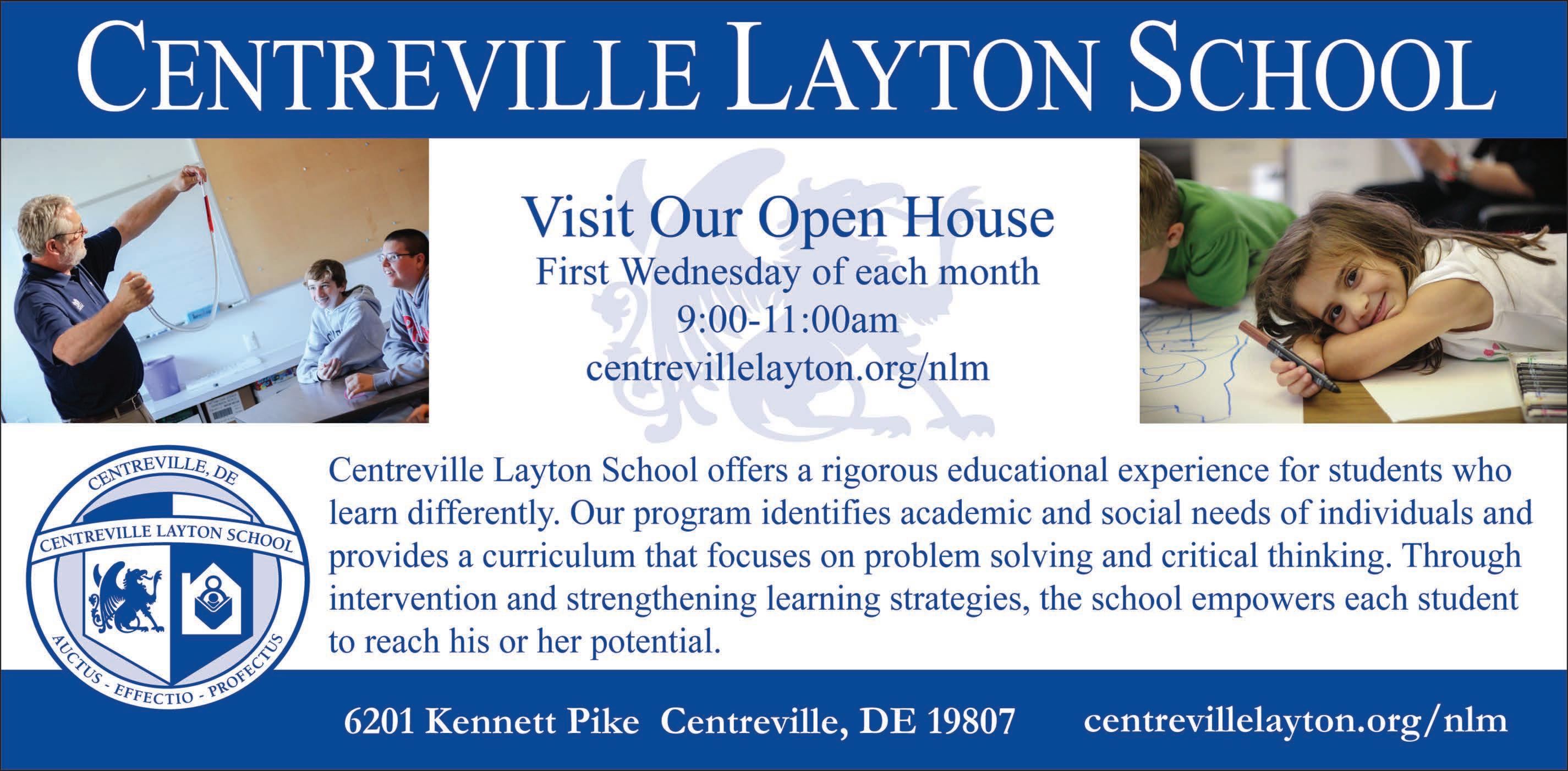 Centreville Layton School, the result of a merger between Centreville School and Layton Preparatory School, serves students who learn differently from prekindergarten through 12th grade. It is the first school of its kind in the state, and is proud to be on the cutting edge of education. Centreville Layton School offers a rigorous educational and cultural experience for students who learn differently. The program identifies academic and social needs of the individual and