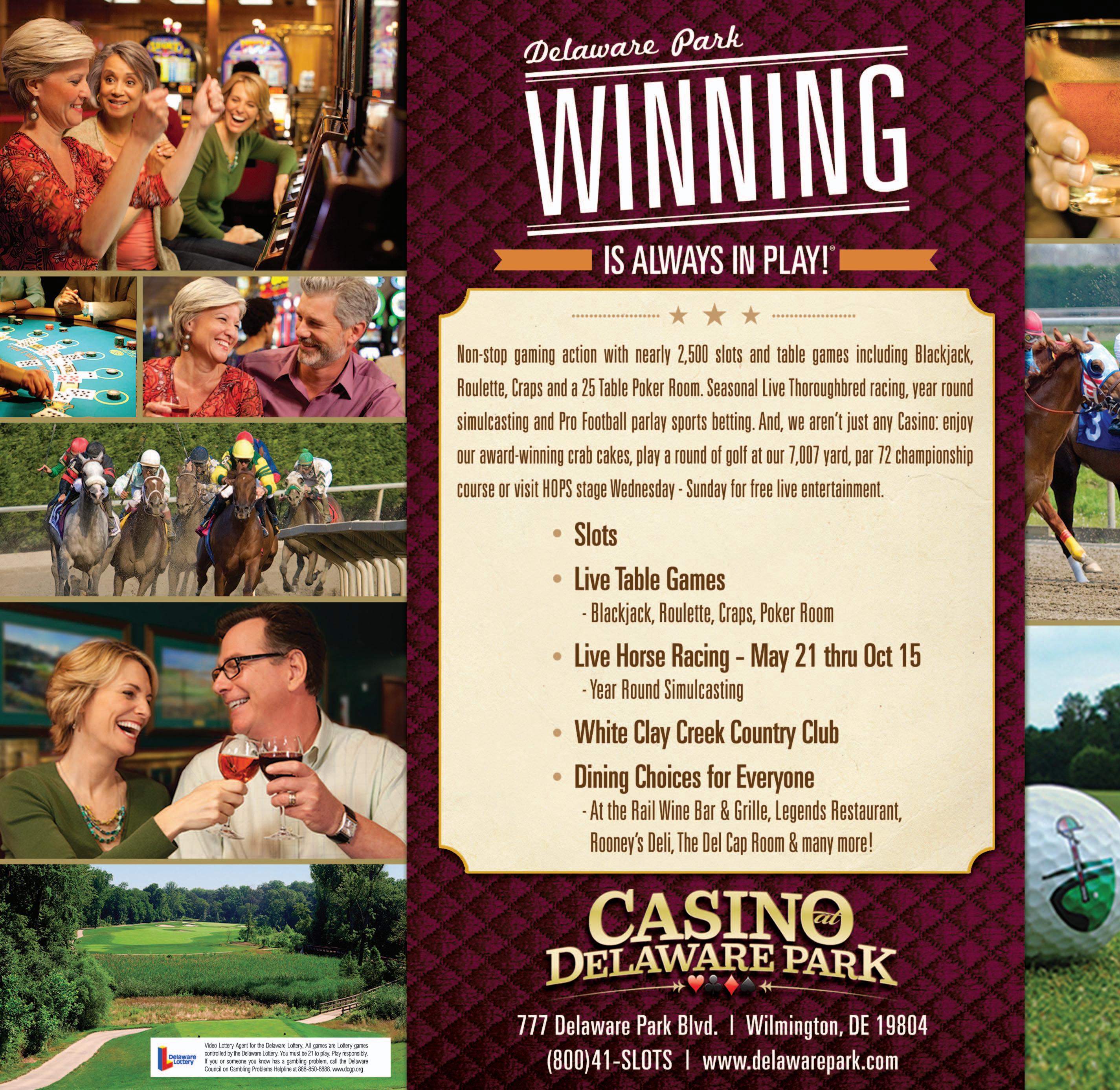 Delaware Park is Always in Play just minutes away from Chester County. This multi-level, non-smoking entertainment and gaming facility offers something for everyone 24/7: 2,500 slot machines, an array of live table games, cash and tournament poker rooms, Keno, free Wednesday-Sunday evening live entertainment at HOPS stage and many dining options. The adjoining Clubhouse offers additional dining choices, seasonal pro football parlay sports betting, year-round simulcasting and live Thoroughbred horse racing. Please check www.delawarepark.com for the 2015 racing schedule and current promotions/specials.