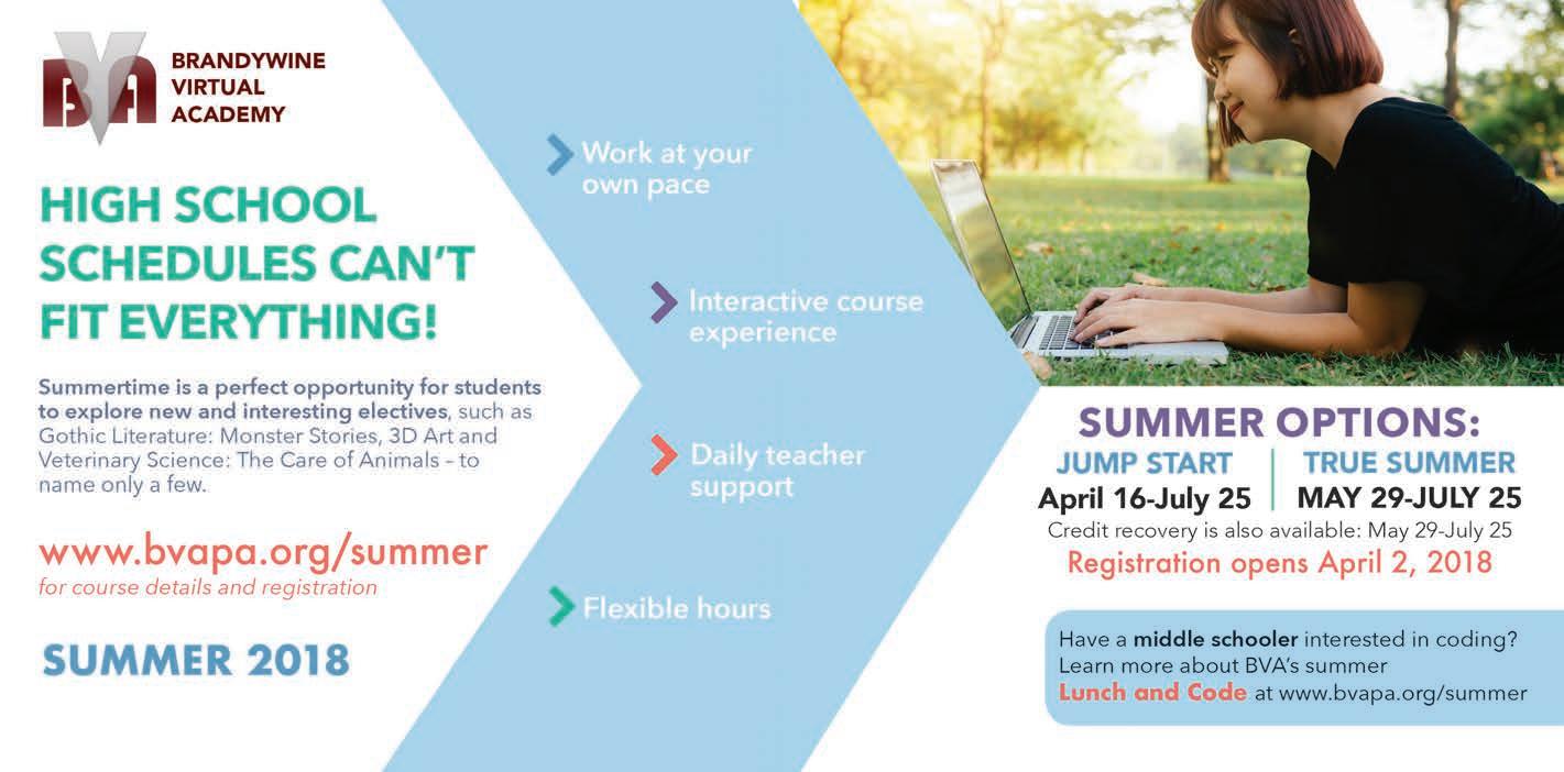 Summer is a great opportunity for high school students to catch up on credits or get ahead of next year’s busy schedule. Brandywine Virtual Academy (BVA) is pleased to offer a flexible, interactive online course experience tailored to the needs of each student. Did a class not work out so well this past year? Our nine-week Credit Recovery session can get students right back on track. Not able to fit all of the electives you really wanted in your schedule next year? Or, do you want to try an honors or Advanced Placement (AP) course at school next year and want to build your confidence? The 15-week Jump Start session or nine-week True Summer session with over 100 elective options might be your answer!