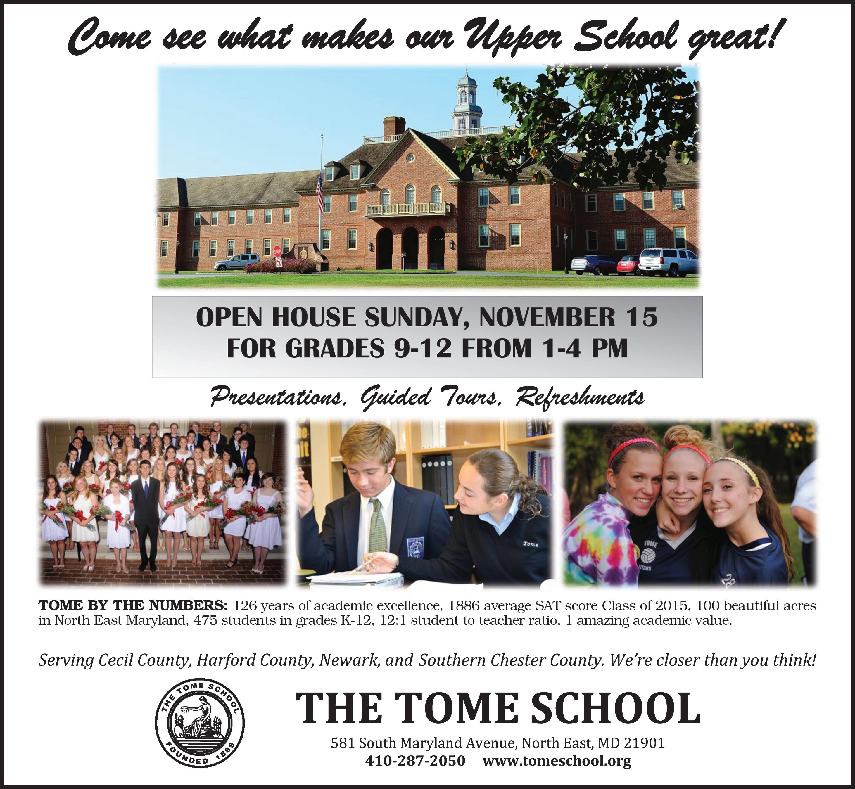 Tome is proud of its long tradition of academic excellence dating back to 1889, when Jacob Tome founded the school in Port Deposit, Md. Today, the school enrolls over 470 students from kindergarten through twelfth grade at the Hostetter-Hogue Campus in North