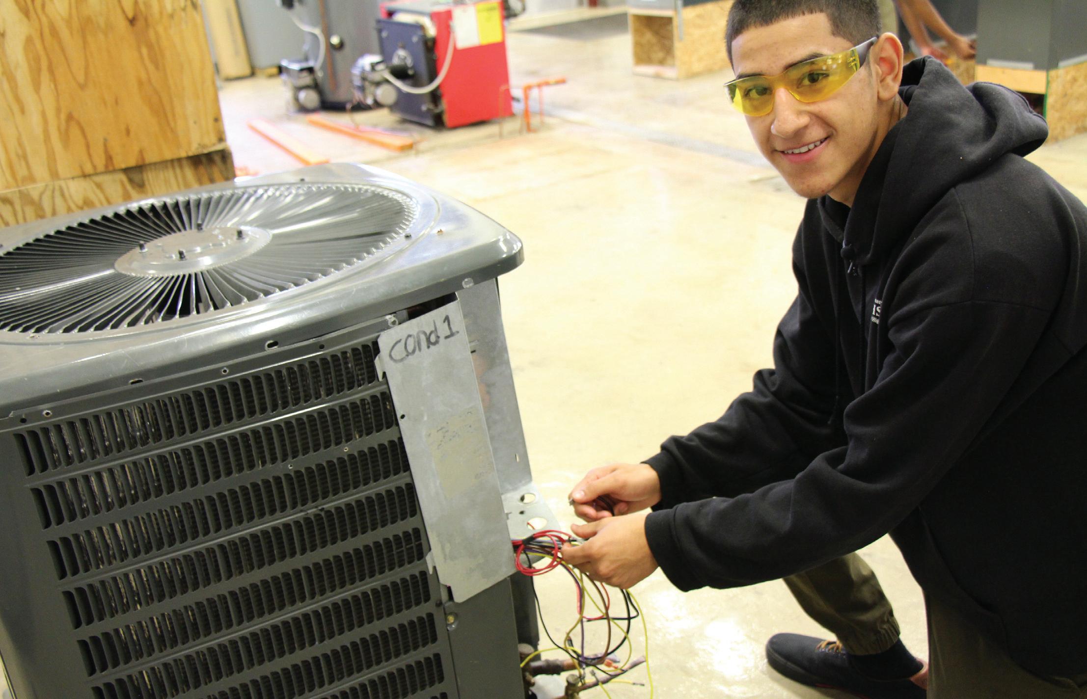 TCHS Pennock’s Bridge Campus student, Thomas Baires, works on an air conditioning unit.