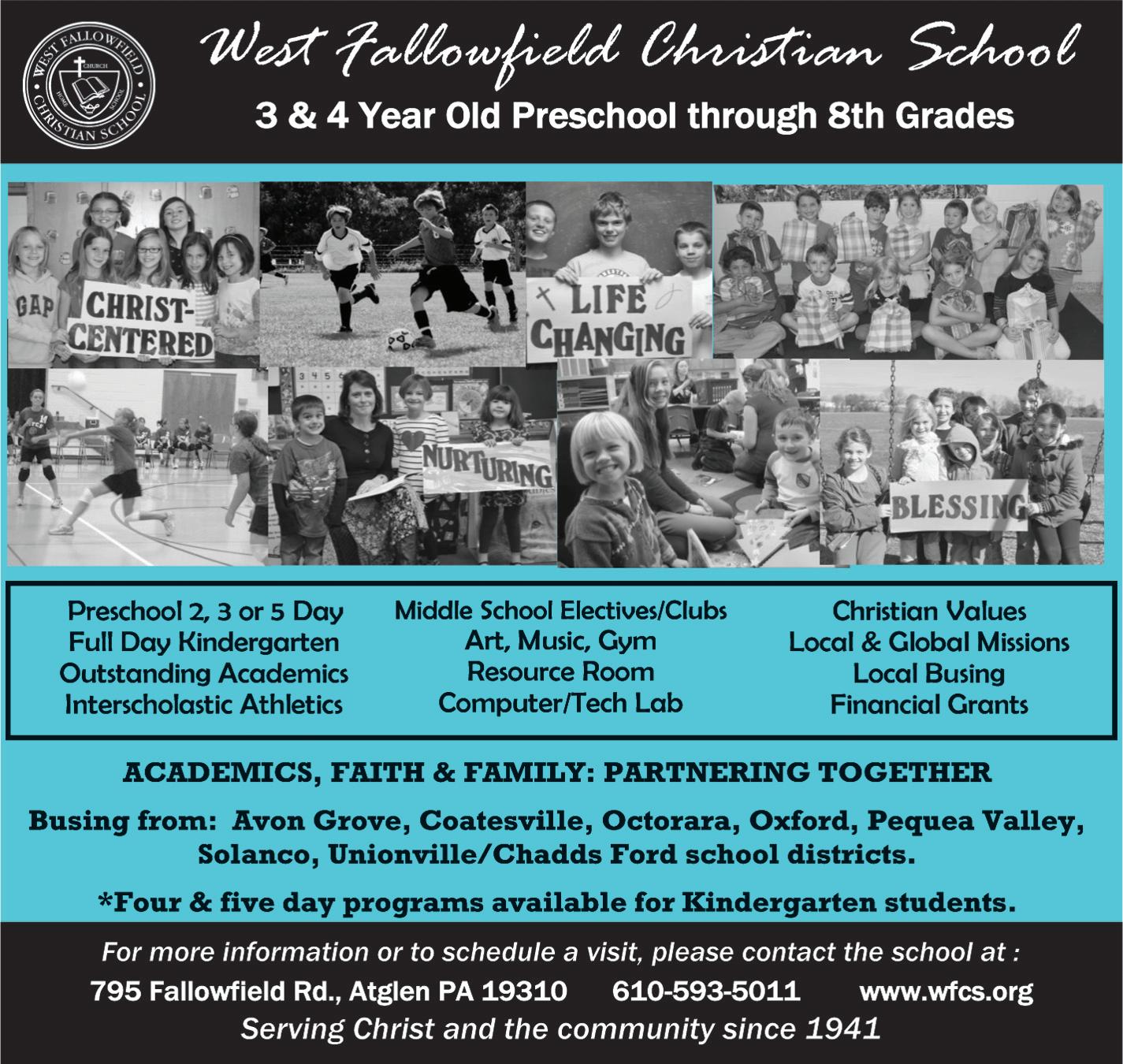 For seventy-four years, West Fallowfield Christian School has been providing quality Christian education for families and students in the surrounding communities. The school is enriched by its diverse student body, which attends more than 30 churches in the Chester and Lancaster County areas. Bus transportation is supplied for K-8 students residing in the Avon Grove, Coatesville, Octorara, Oxford, Pequea, Solanco, and Unionville-Chadds Ford Districts.