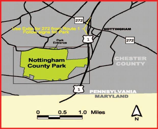 Nottingham County Park is located at 150 Park Road in Nottingham, Pa., 19362 in West Nottingham Township, five miles southwest of Oxford, off U.S. Route 1, just above the Maryland state line in southwestern Chester County. For event information, road restrictions and parking questions, contact Nottingham County Park at 610-932-2589.