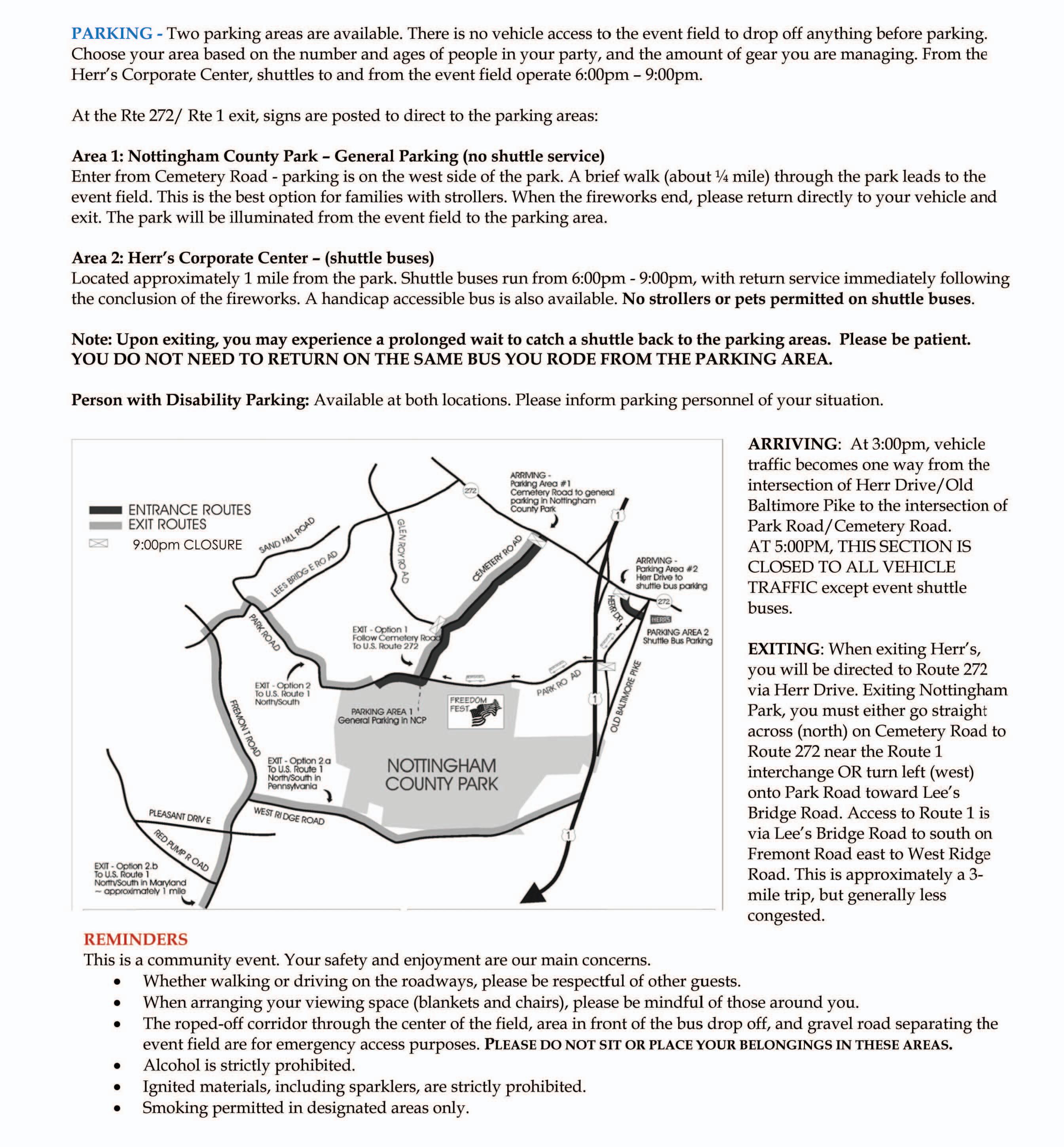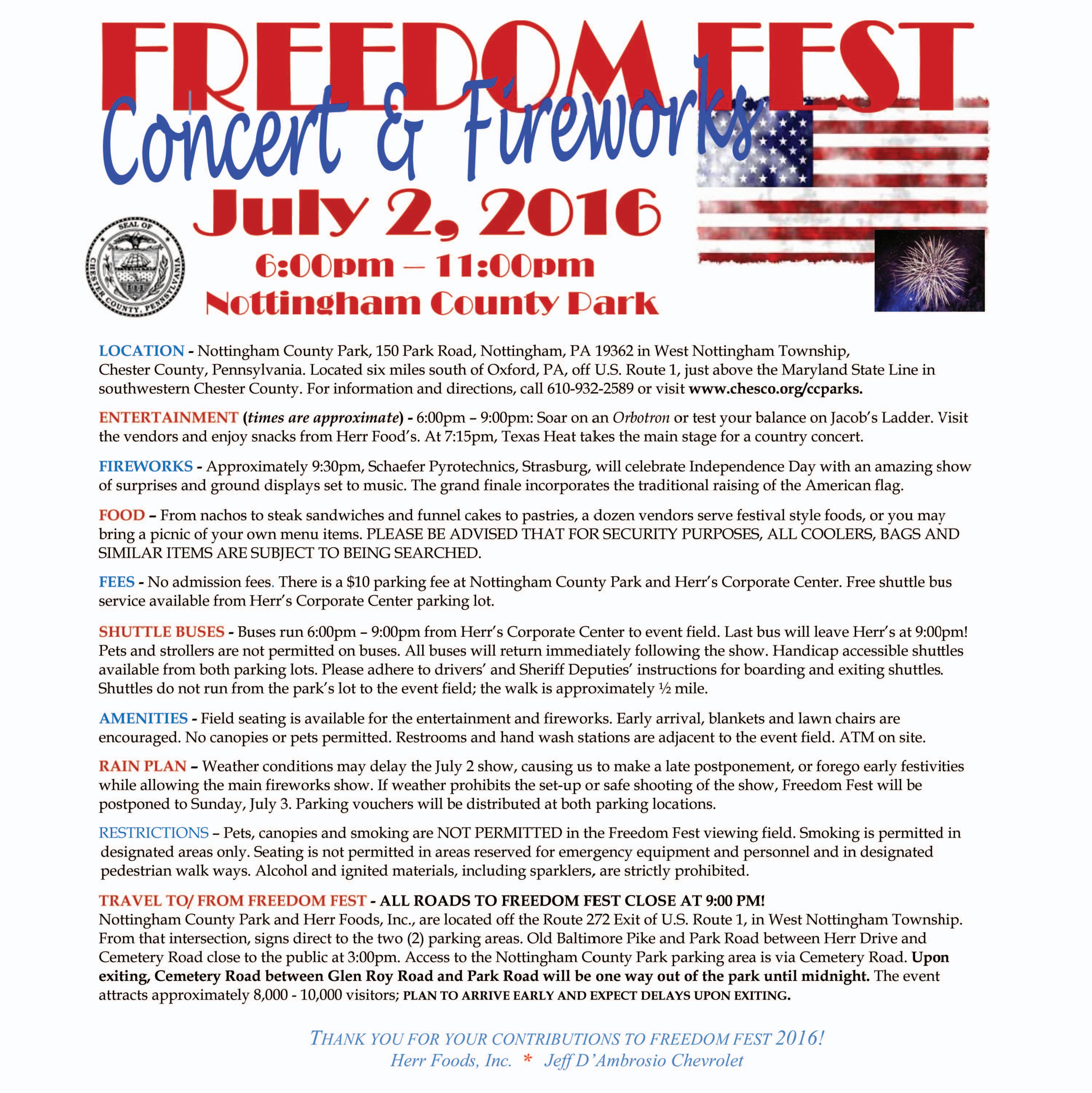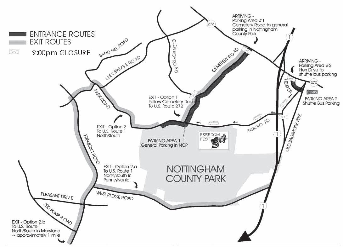 Freedom Fest traditionally attracts 8,000 to 10,000 visitors, so leave plenty of time for travel and expect delays upon exiting. In cooperation with West Nottingham Township officials, parking plans and road restrictions will be in effect.
