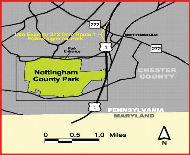 Park resource materials are available at the park office. Nottingham County Park is located at 150 Park Road, Nottingham, six miles south of Oxford off Route 1 Bypass in West Nottingham Township. For park information, please call 610-932-2589 or visit www.chesco.org/ccparks.
