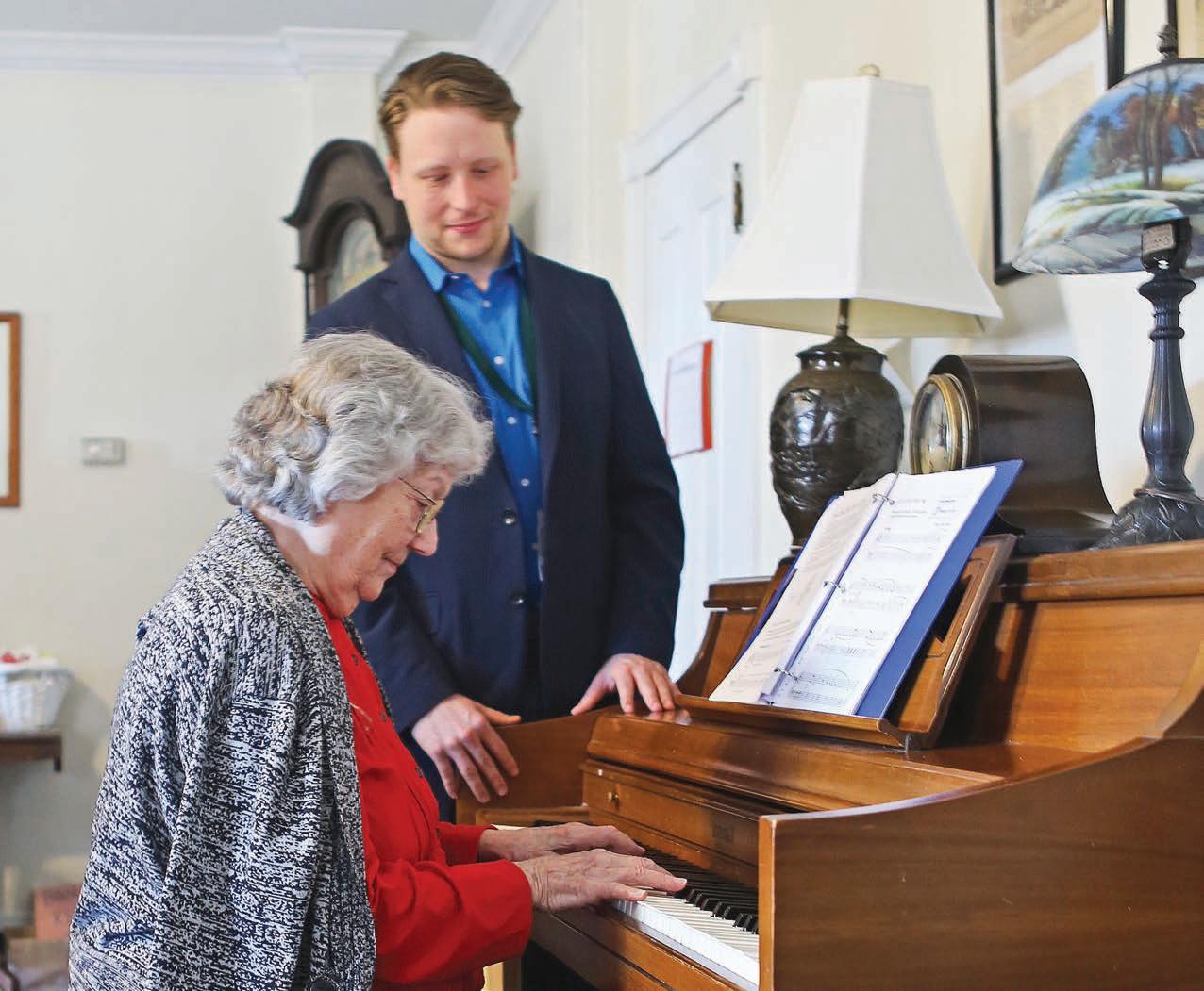 Megee not only supports veteran musicians like pianist Mary Brewer, but also is there to teach new skills to folks who might not have played instruments before. He also has formed an alliance with Unionville High School, where he is assistant director of their latest musical, “Into the Woods.” During afternoon practices, they come to the Friends Home for their work while the residents are there to look on.
