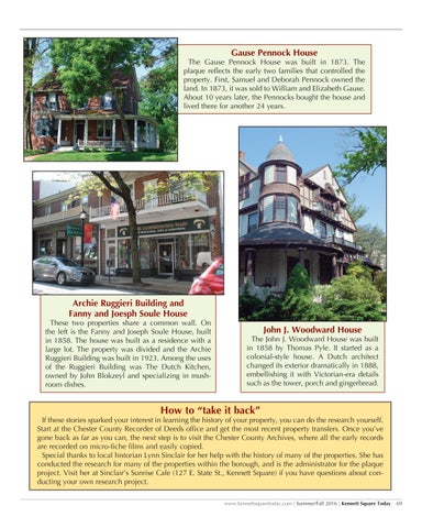 If these stories sparked your interest in learning the history of your property, you can do the research yourself. Start at the Chester County Recorder of Deeds office and get the most recent property transfers. Once you’ve gone back as far as you can, the next step is to visit the Chester County Archives, where all the early records are recorded on micro-fiche films and easily copied. Special thanks to local historian Lynn Sinclair for her help with the history of many of the properties. She has conducted the research for many of the properties within the borough, and is the administrator for the plaque project. Visit her at Sinclair’s Sunrise Cafe (127 E. State St., Kennett Square) if you have questions about conducting your own research project. www.kennettsquaretoday.com | Summer/Fall 2016 | Kennett Square Today