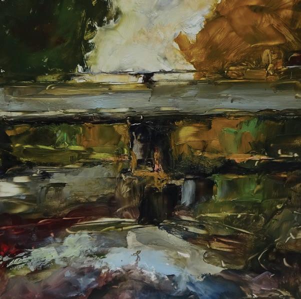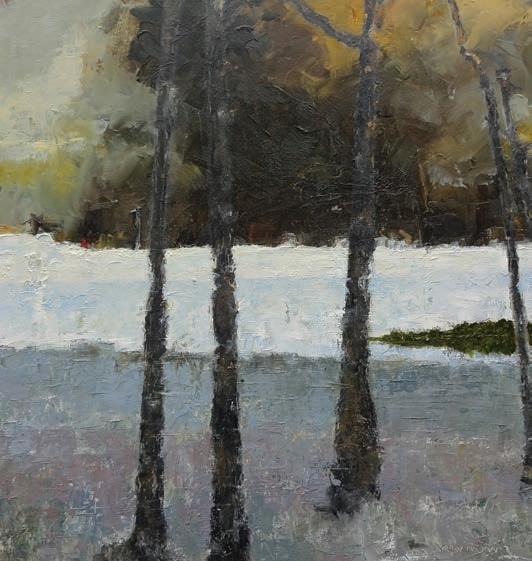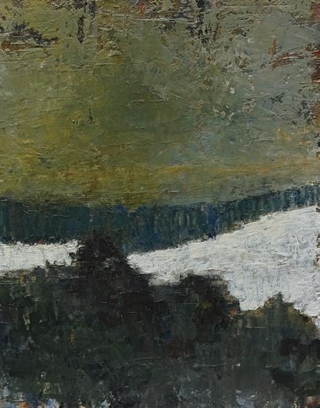 Working within a fairly small format concentrates his works to their essentials – a line of trees, a shadow, a highlight that beckons you but doesn’t quite reveal itself. The surfaces of his oils are scraped, overlapped and scuffed, as if time has worn through several layers, leaving suggestions of what lies beneath.
