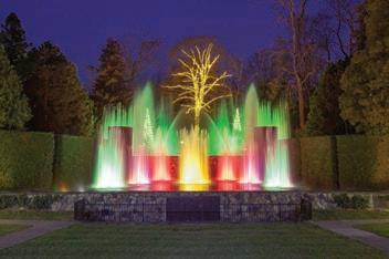 Outside, more than 500,000 lights are strung on 150 trees. New displays include dancing lights that simulate the fountain jets in the Main Fountain Garden. The towering trees bordering the Large Lake are the backdrop for a repeating illuminated light show set to holiday music.
