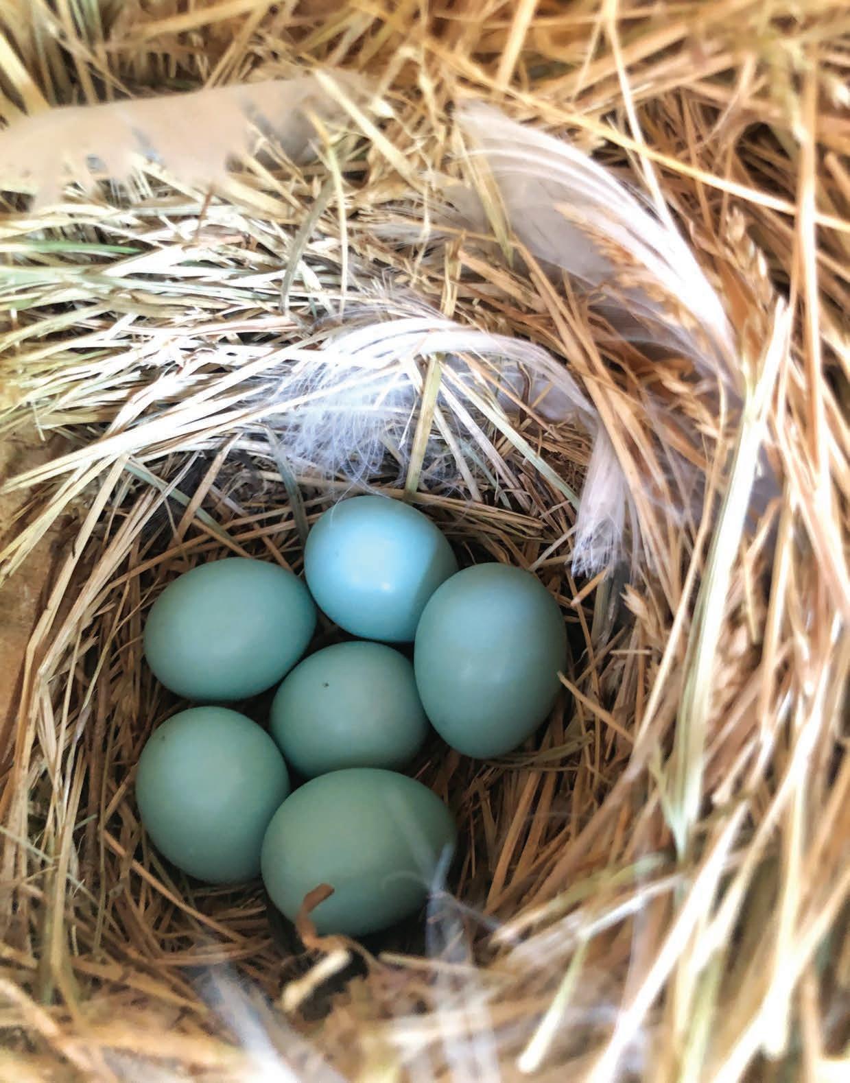 Movie character Forrest Gump famously compared life to a box of chocolates— “You never know what you are going to get.” Opening a nesting box is similarly filled with wonder—there could be a nest, eggs, or babies. Seeing the nest will help verify which bird species moved in. Bluebirds lay blue eggs and have neat nests of pine needles or sometimes straw. Chickadees have brown-speckled white eggs and use moss, with the egg cup lined with soft white fur. Tree swallows lay pure white eggs and use straw or pine needles with feathers on top to hide the eggs. House wrens, a cute but aggressive native, have eggs similar to chickadees, and disheveled twig nests.