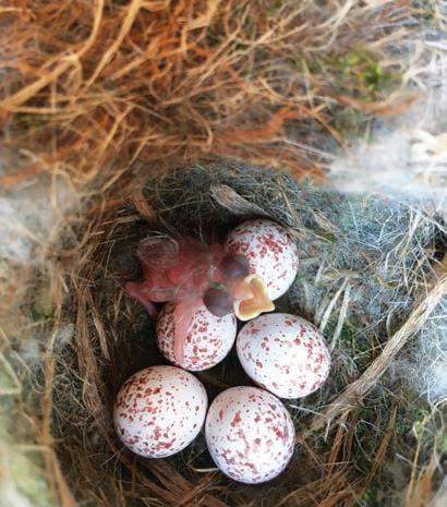 or five days to build a nest. They then lay one egg per day. After she lays all of her eggs (usually between four and six), she provides warmth by sitting on them and the 14-day incubation period begins. After hatching, babies stay in the box for 18 to 20 days. When it’s time for them to fledge, the parents stop feeding and one by one, like planes taking off at an airport, the birds come up to the entry hole and fly out of the box. They no longer need the nest, so it’s time to clean it out and hope for another round.