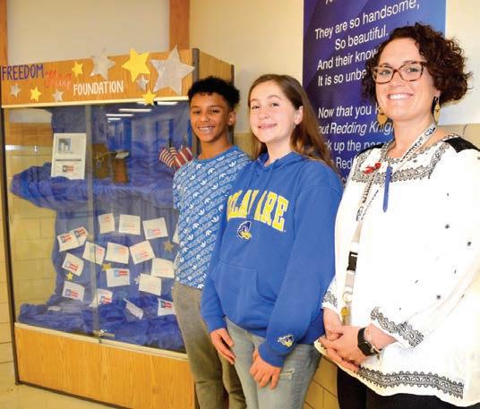 Katie Wright, a seventh-grade teacher at Louis Redding Middle School in Middletown, was selected this past fall as the first teacher in Delaware to work with the Freedom Flag Foundation to teach students about the events of Sept. 11, 2001. Pictured with Wright are two of her students – Darryl Turner and Peyton Brockell.
