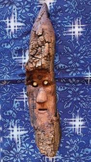Nearly described this wood spirit this way: “Cormac after my fourth-greatgrandfather. Cottonwood from a recent trip to Colorado. Pearl eyes. “Dream” in Ogam.