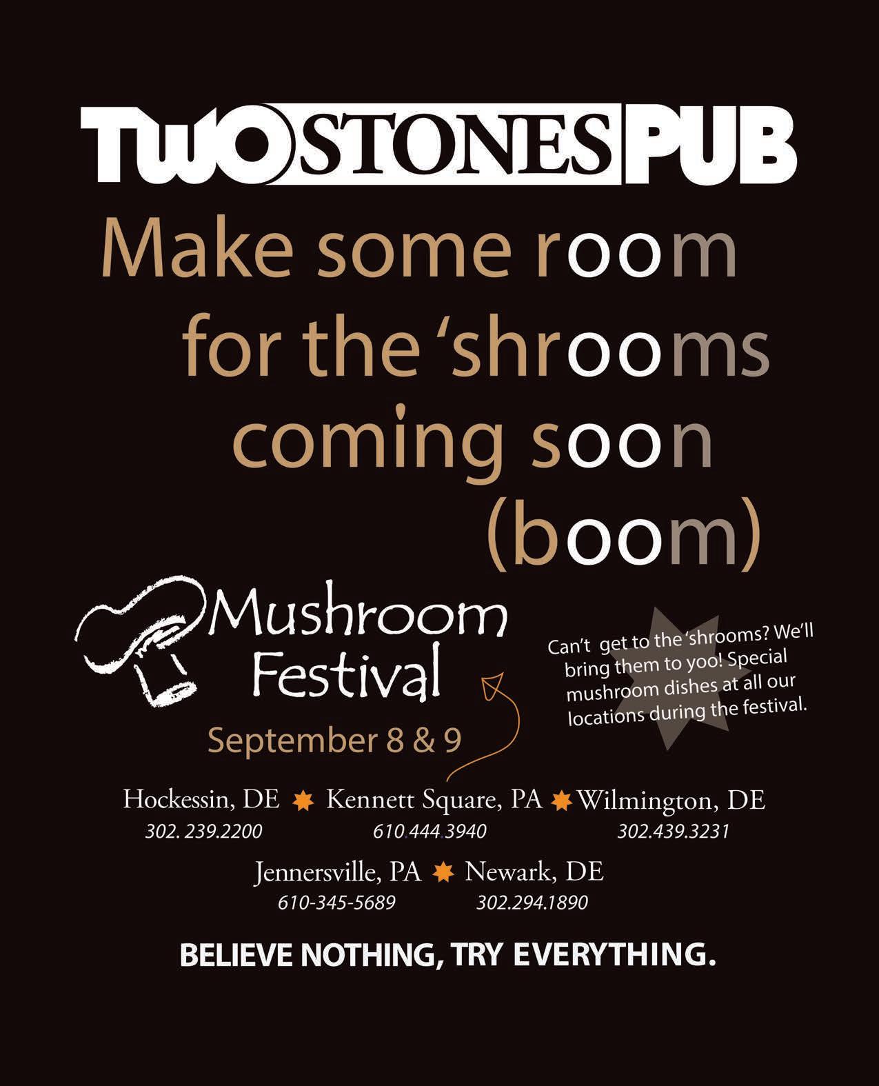 The Mushroom 5K Run and Frances Ferranto 2-mile Fun Walk on Sunday, Sept. 9, has an exciting new course for 2018. There’s even a new prize structure for competitive runners. Start your Sunday with a run or brisk walk through picturesque Kennett Township, even passing by a few mushroom houses along the way. (See article on page 52.)