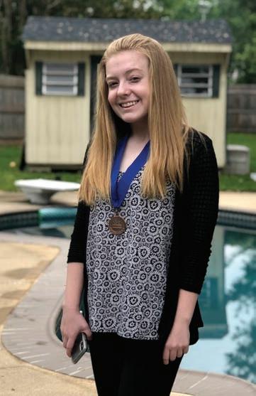 Nicole wears a History Day medal while posing in the back yard of her Newark home.